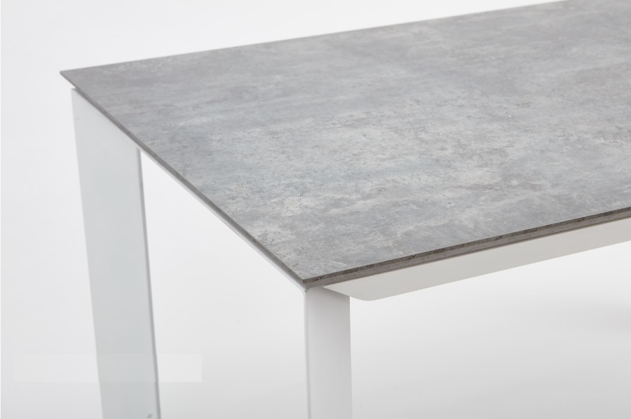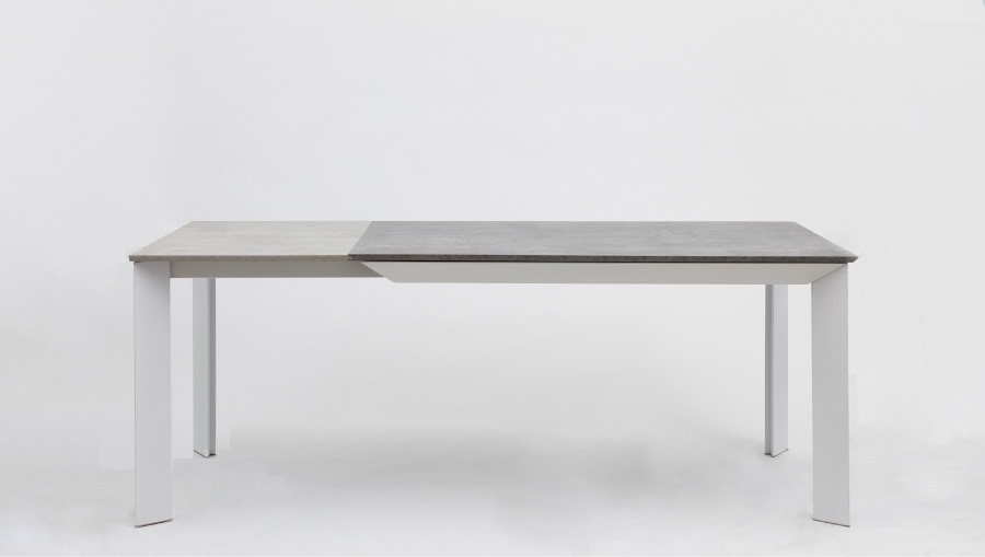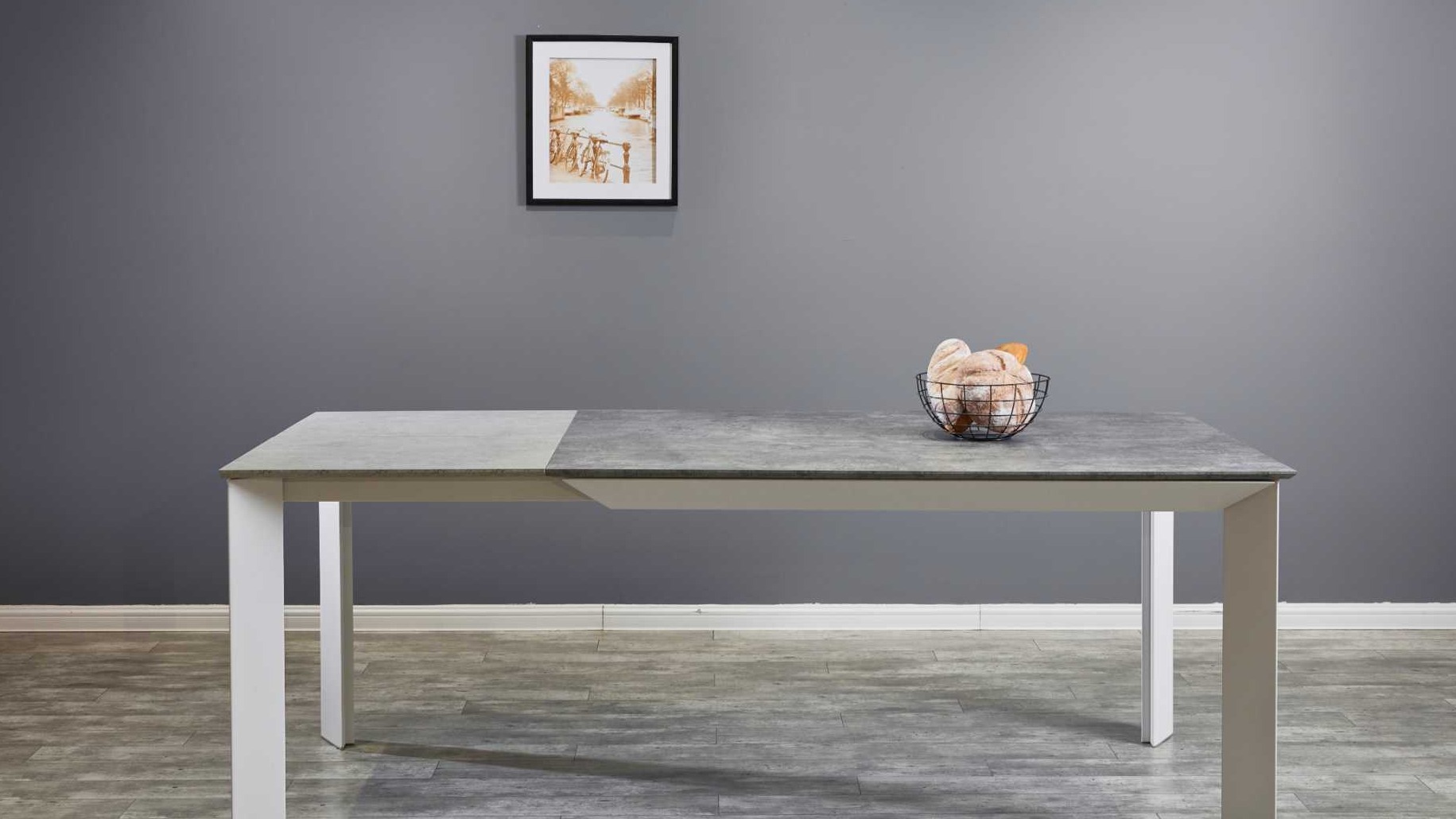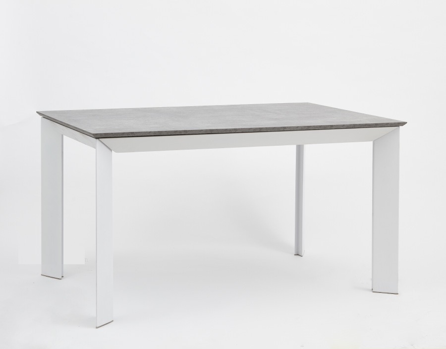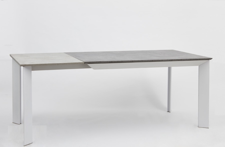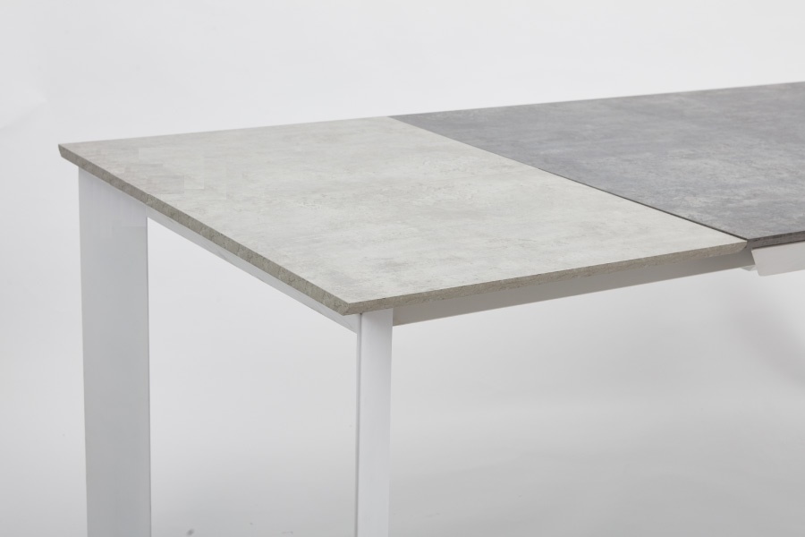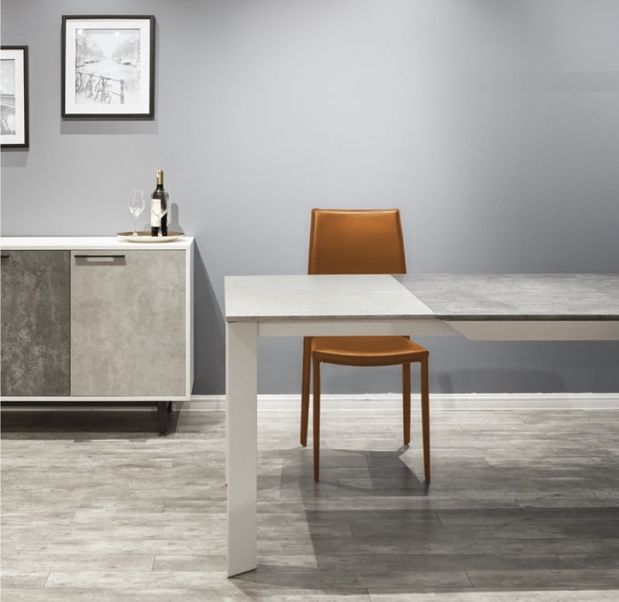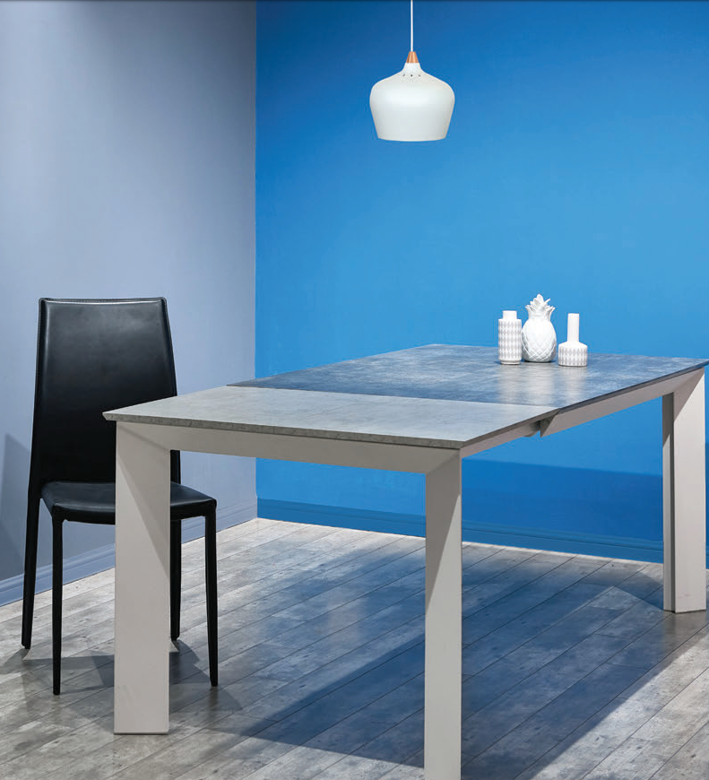 Chất liệu: Bàn mở rộng, mặt chính và phụ phối gỗ màu Bê-ton, sắt trắng