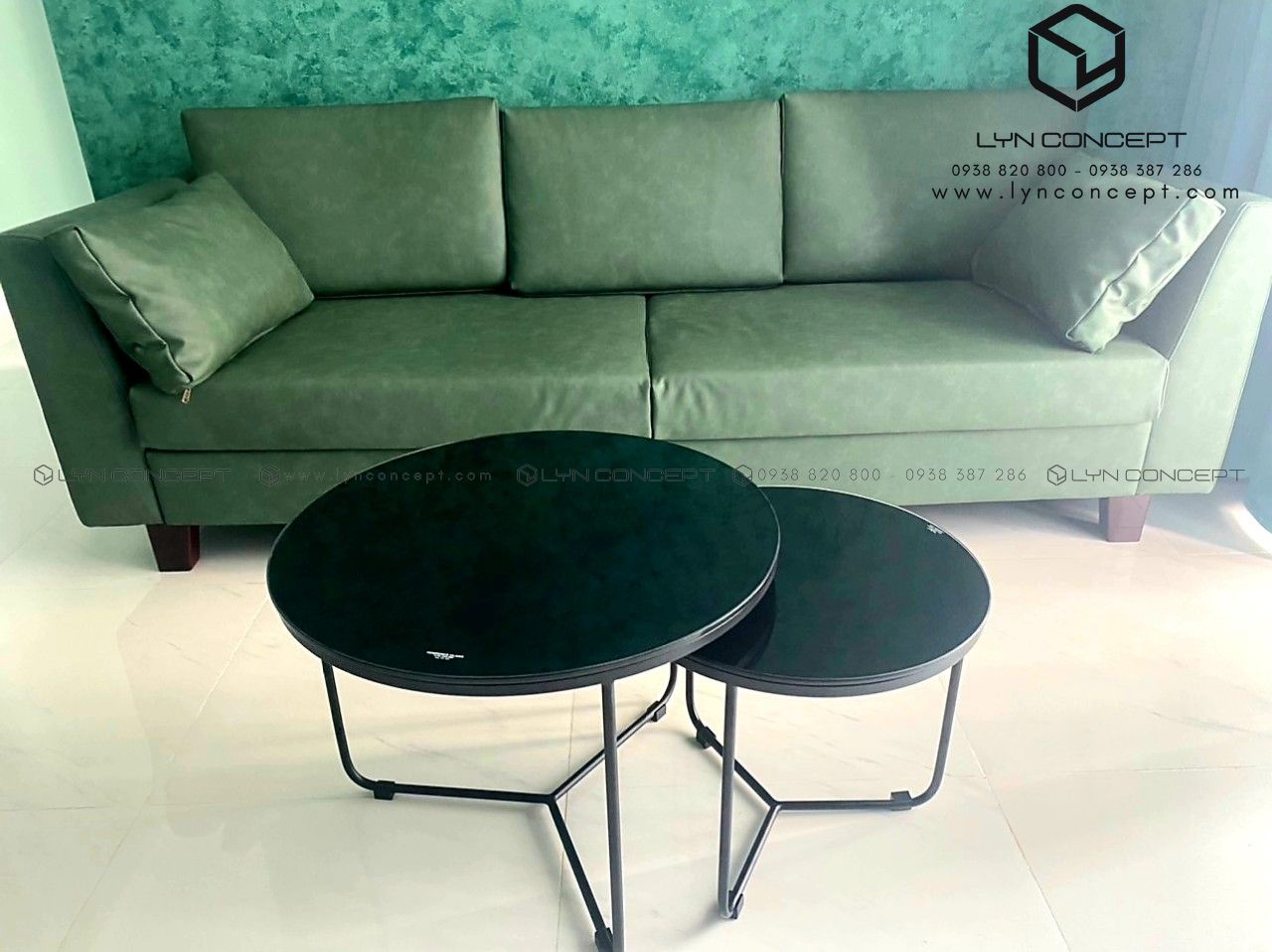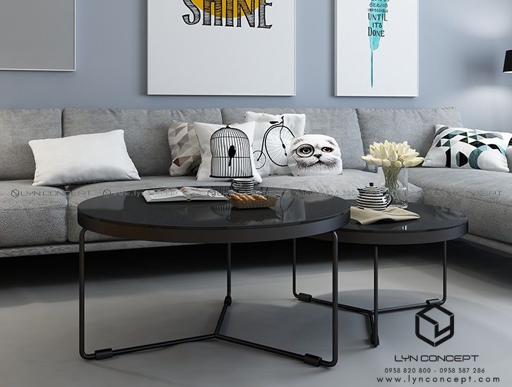 Mặt kính đen bóng bẩy trên bàn trà đôi tròn, dễ dàng làm nổi bật không gian phòng khách