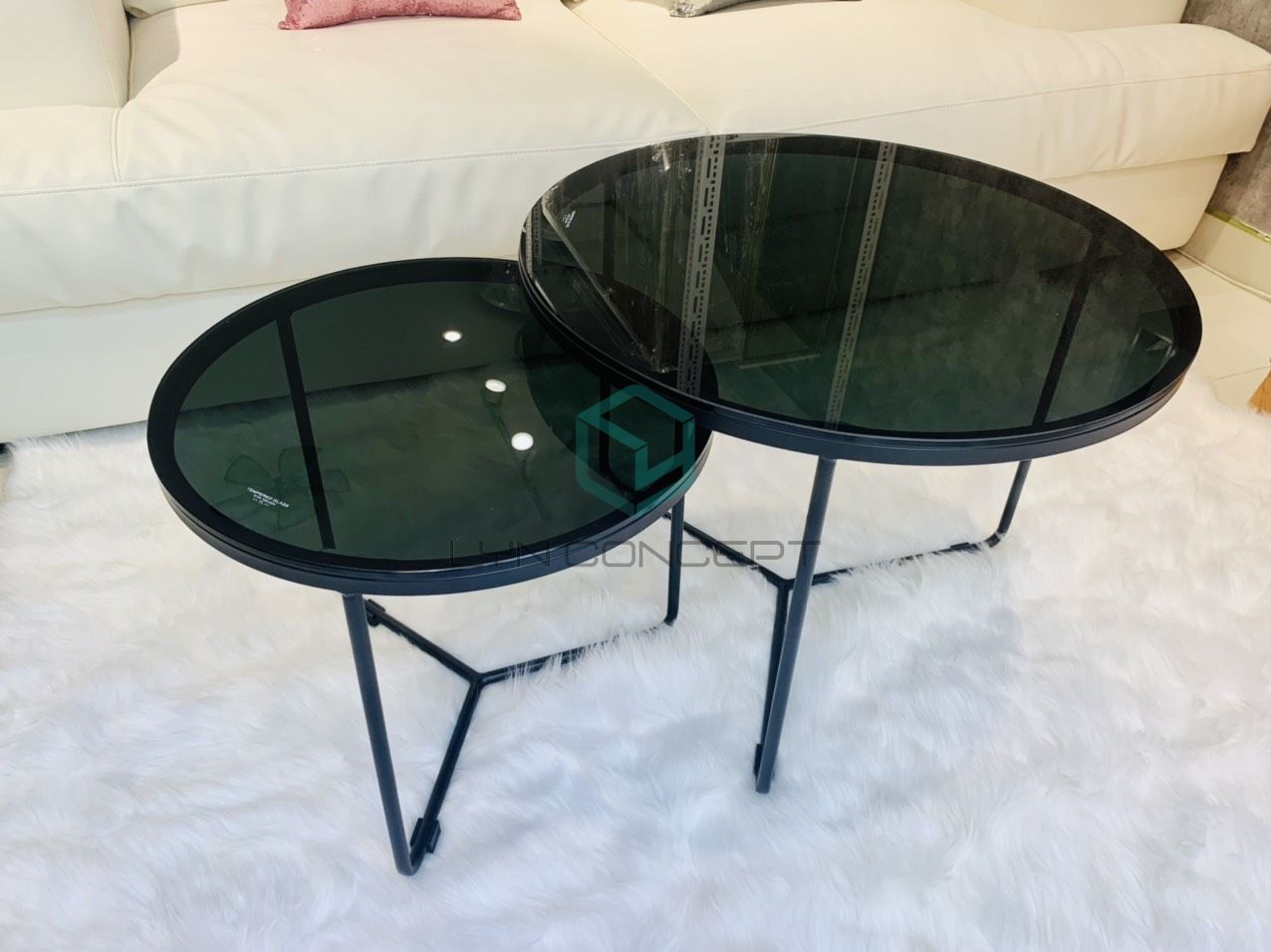 Bàn trà đôi tròn với mặt kính đen bóng bẩy và chân Y sắt sơn đen, tạo nên vẻ đẹp sang trọng và bền bỉ