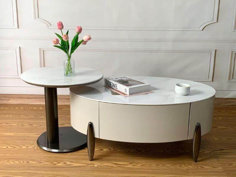 Trong năm 2025, các mẫu bàn trà mặt đá nhập khẩu phổ biến sẽ thiên về thiết kế hình tròn hoặc oval, kết hợp chân inox mạ vàng hoặc sơn tĩnh điện đen. Màu đá được ưa chuộng là trắng vân mây, xám khói hoặc marble đen. Một số mẫu còn tích hợp ngăn kéo, kệ phụ tiện lợi.