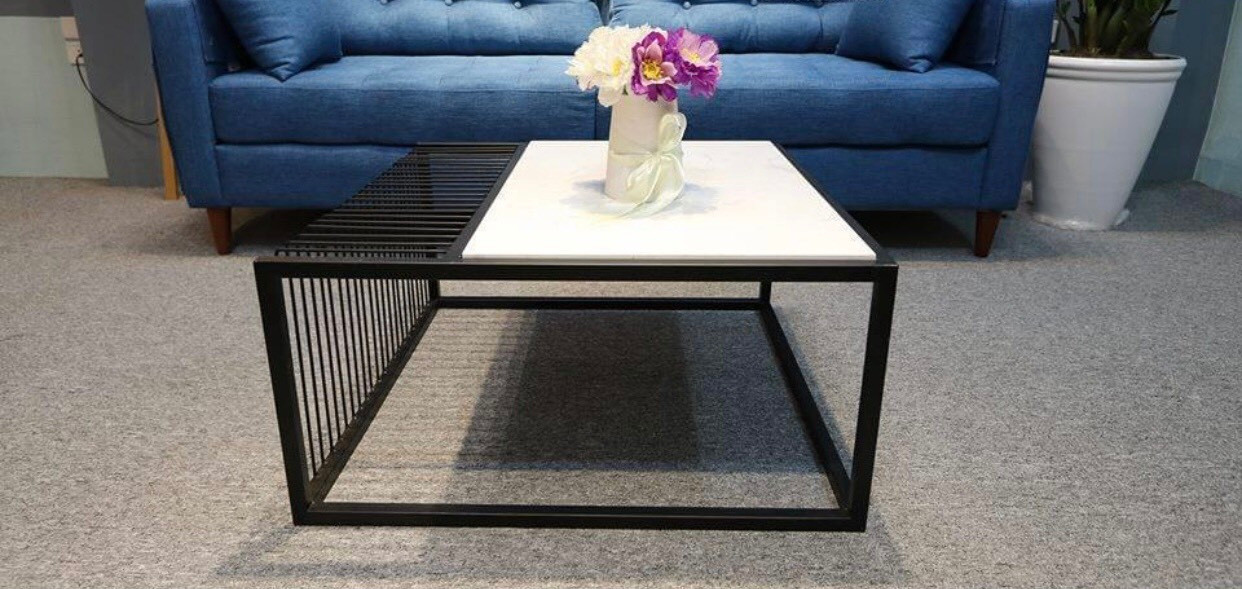 Bàn Trà Vuông D60 Đá Trắng Chân Sắt Nan Đen - BT52A