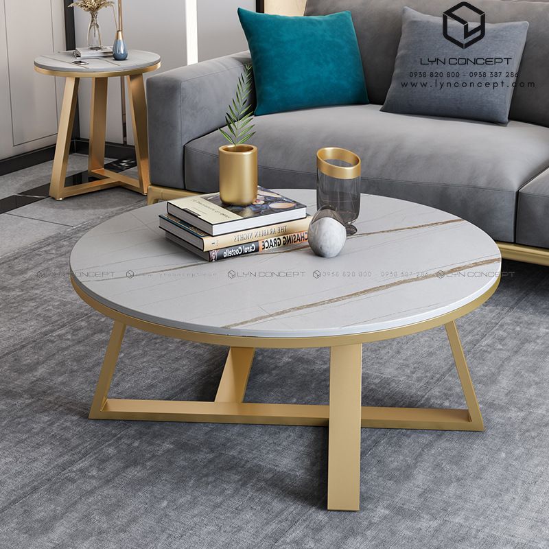 Bàn Trà Tròn D70 Mặt Ceramic Trắng Chân Sắt Sơn Vàng - BT189.15
