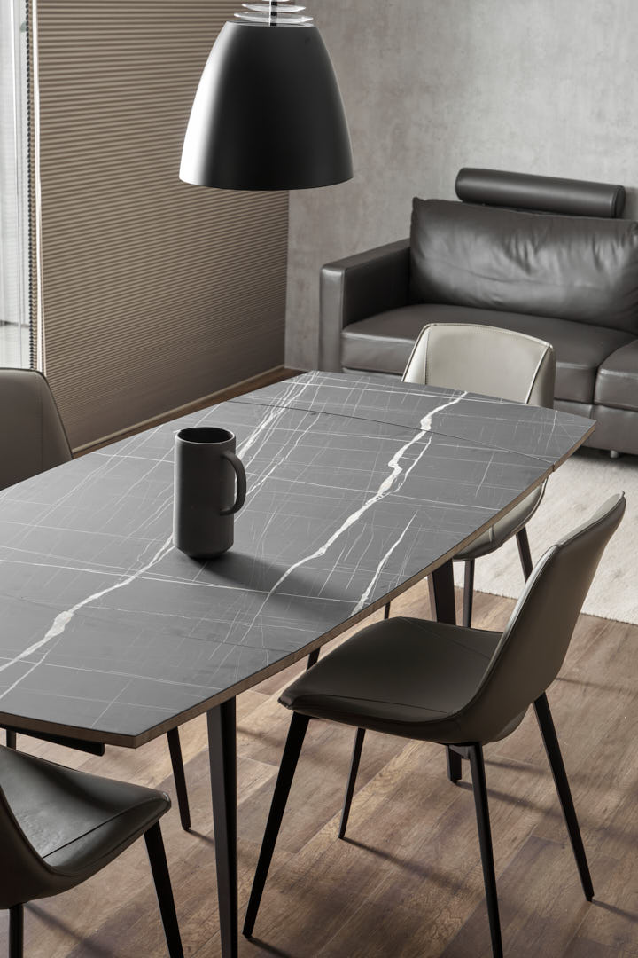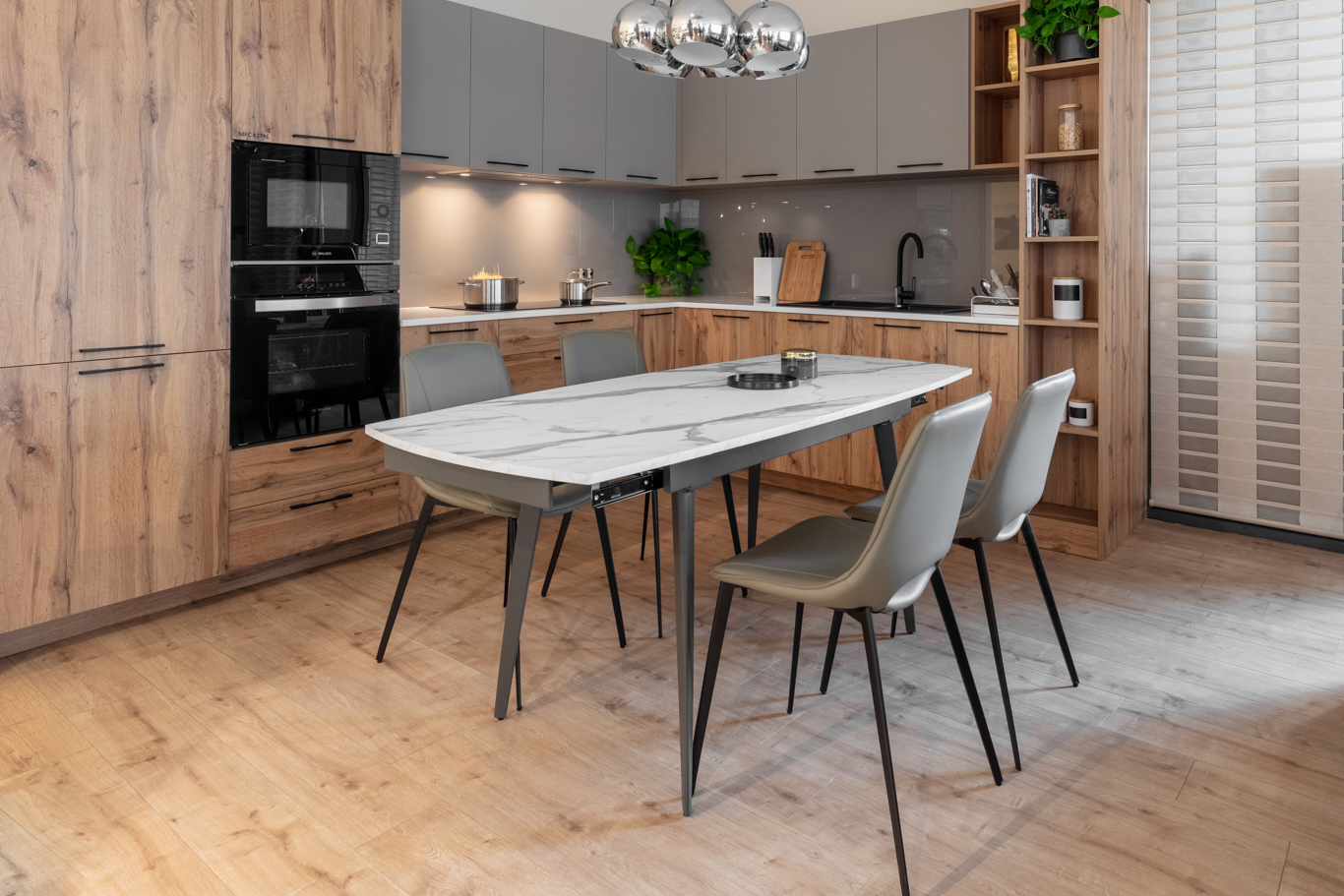 Chất liệu: Bàn mở rộng, màu gỗ Laminate, sắt đen