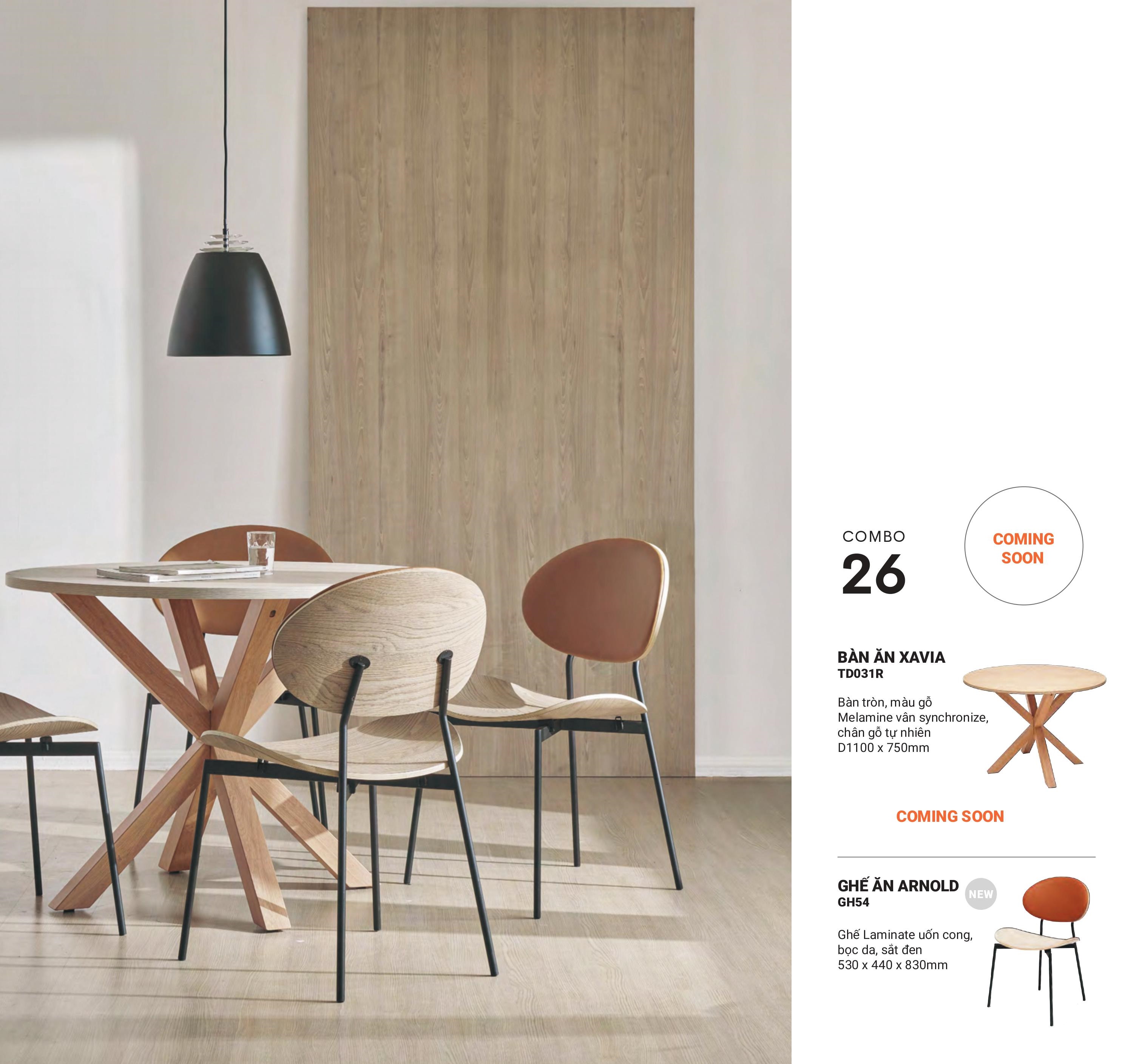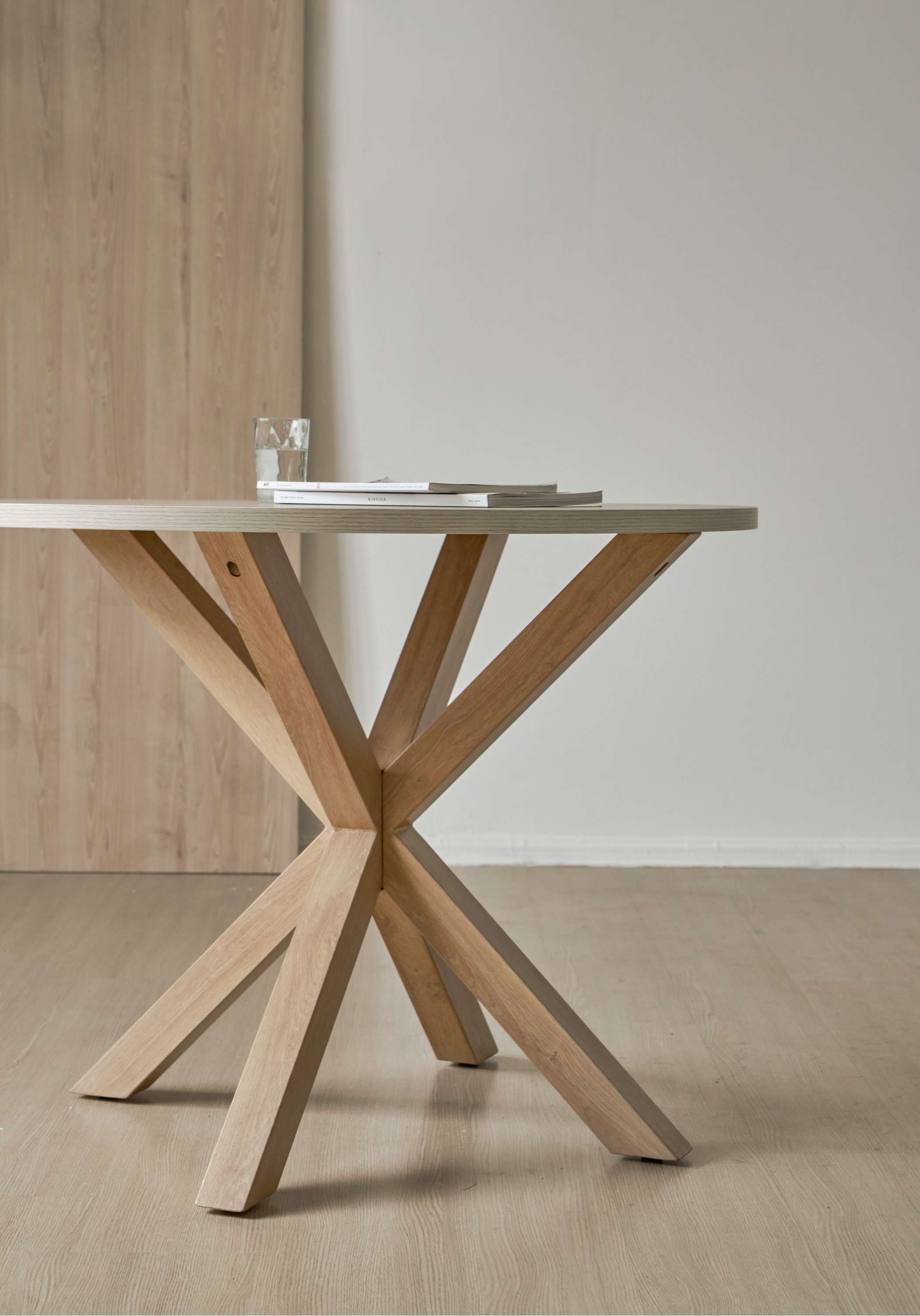 Chất liệu: Bàn tròn, màu gỗ Melamine vân synchronize, chân gỗ tự nhiên