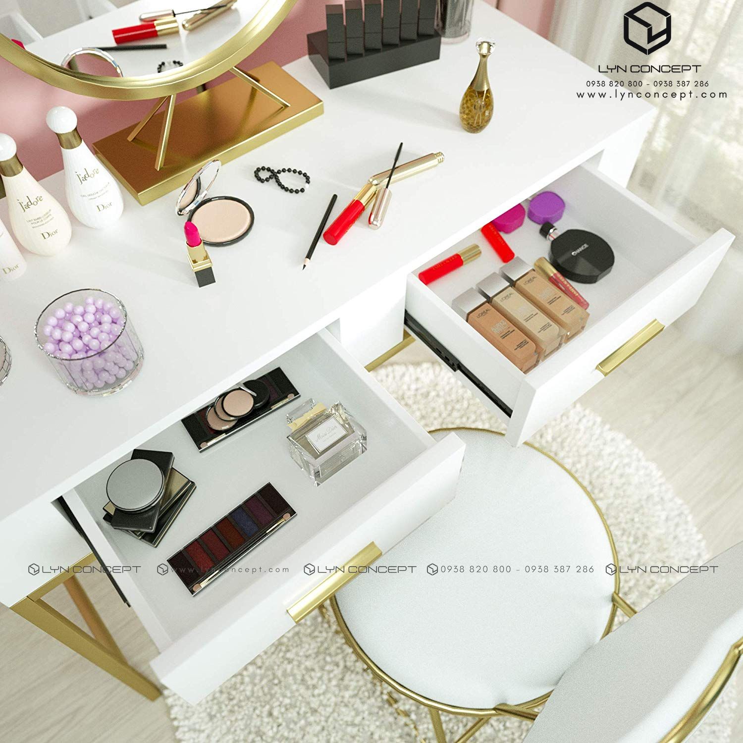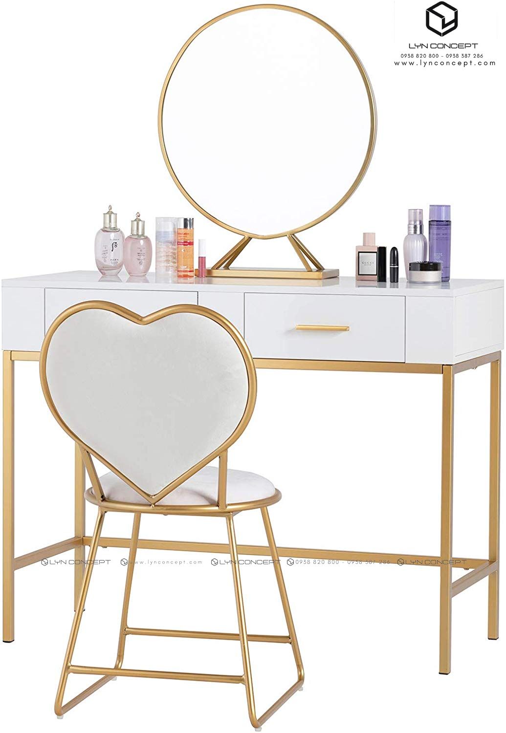 LYN CONCEPT chuyên cung cấp, sản xuất bộ bàn trang điểm chân sắt , được sản xuất trực tiếp, không thông qua trung gian nên giá thành rẻ hơn thị trường từ 15% - 30%. Các mẫu của chúng tôi được thiết kế theo từng bộ sưu tập với mẫu mã đa dạng, đẹp mắt.