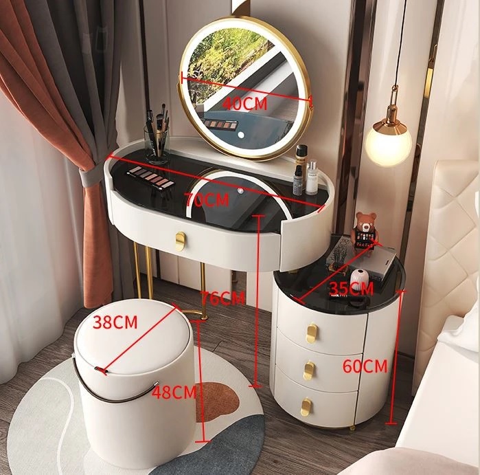 + Tổng cộng có 4 hộc kéo chứa được nhiều mỹ phẩm, trang sức, vật dụng. Chân sắt sơn màu nhũ vàng.