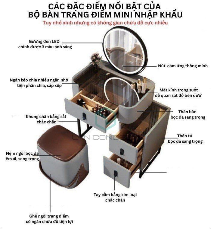 Bộ bàn trang điểm mini nhập khẩu bọc da là món đồ nội thất có ý nghĩa rất đặc biệt đối với các “tín đồ” yêu thích makeup và là món đồ không thể thiếu của chị em phụ nữ hiện đại ngày nay. Bộ bàn trang điểm mini nhập khẩu bọc da cũng là một phần quan trọng giúp trang trí cho căn phòng ngủ thêm phần thanh lịch và ấn tượng hơn.