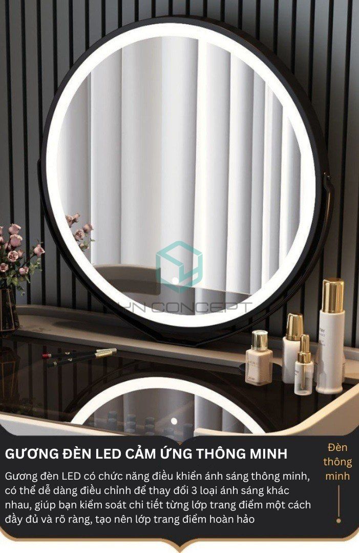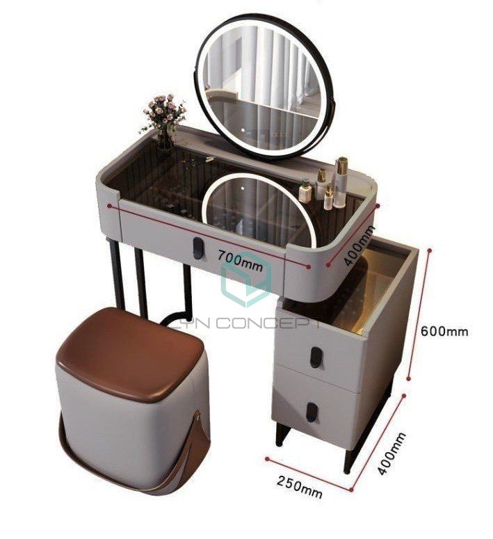 + Bàn trang điểm bằng gỗ bọc da màu xám, mặt bàn bằng kính cường lực màu đen hiện đại. Chân sắt sơn màu đen.