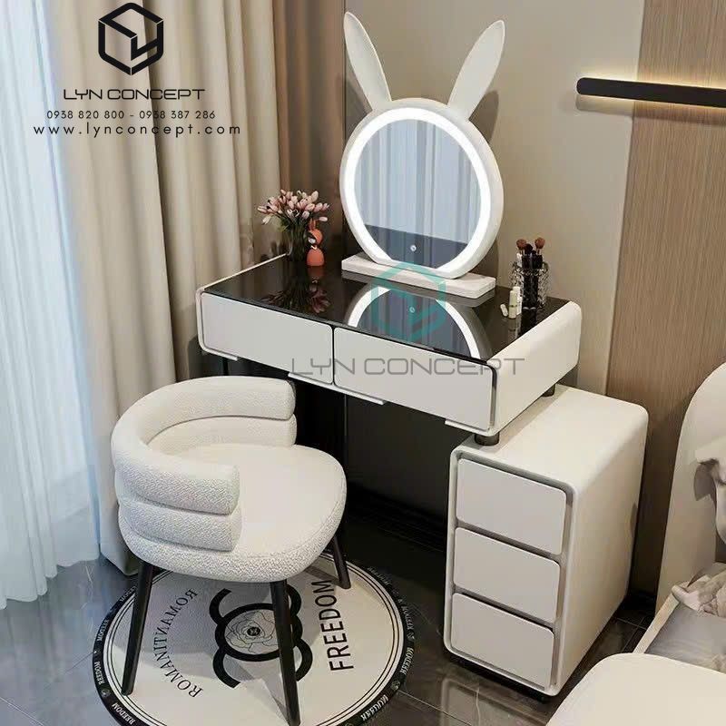 + Bàn trang điểm bằng gỗ bọc da màu trắng, mặt kính đen. Chân sắt sơn màu đen.