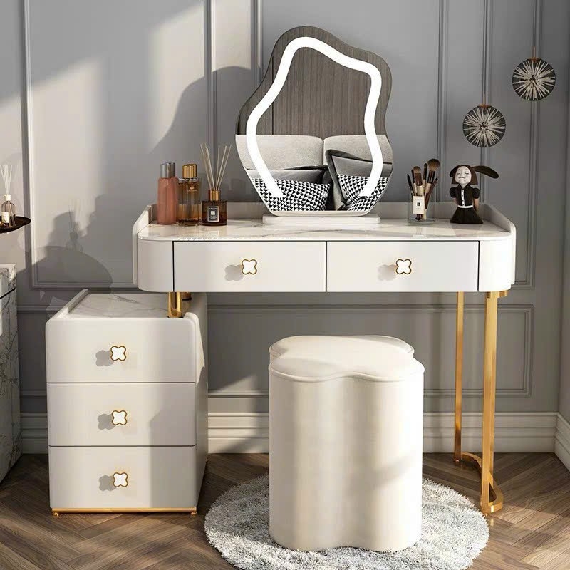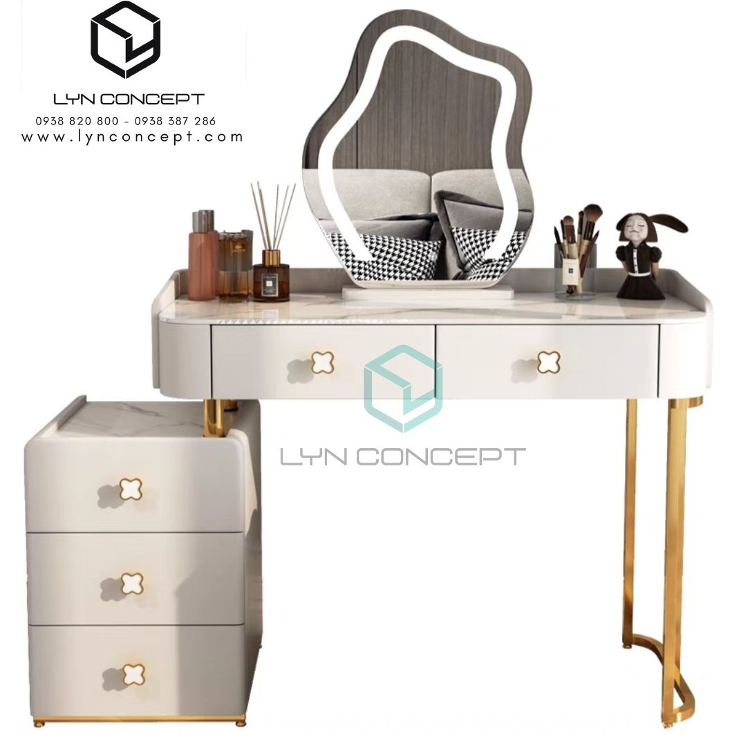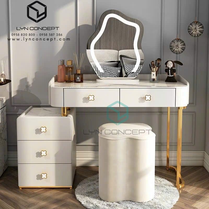 + Bàn trang điểm bằng gỗ bọc da màu trắng, mặt bàn gỗ giả vân đá hiện đại. Chân sắt sơn màu vàng.