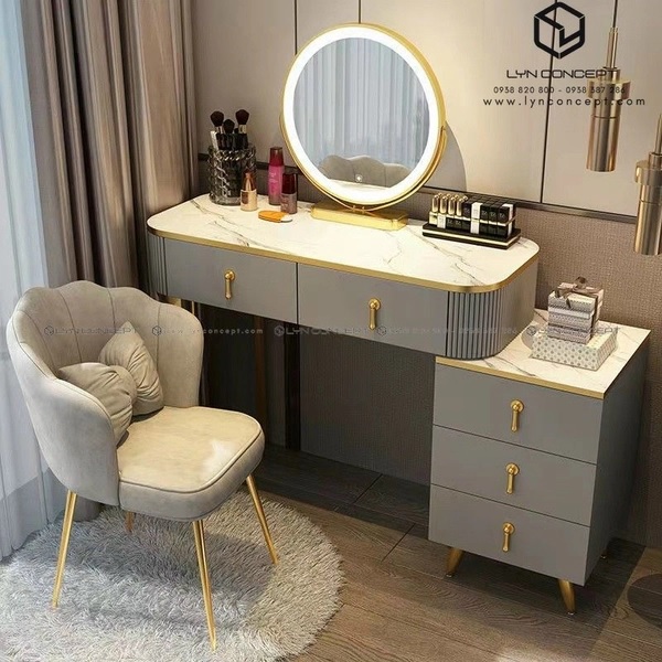 + Bàn trang điểm bằng gỗ sơn màu xám. Chân sắt sơn màu nhũ vàng.