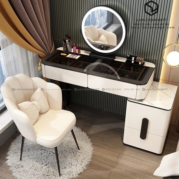 + Bàn trang điểm bằng gỗ sơn màu trắng bóng, mặt kính màu đen. Chân sắt sơn màu đen.