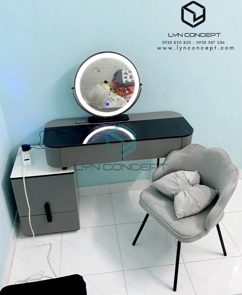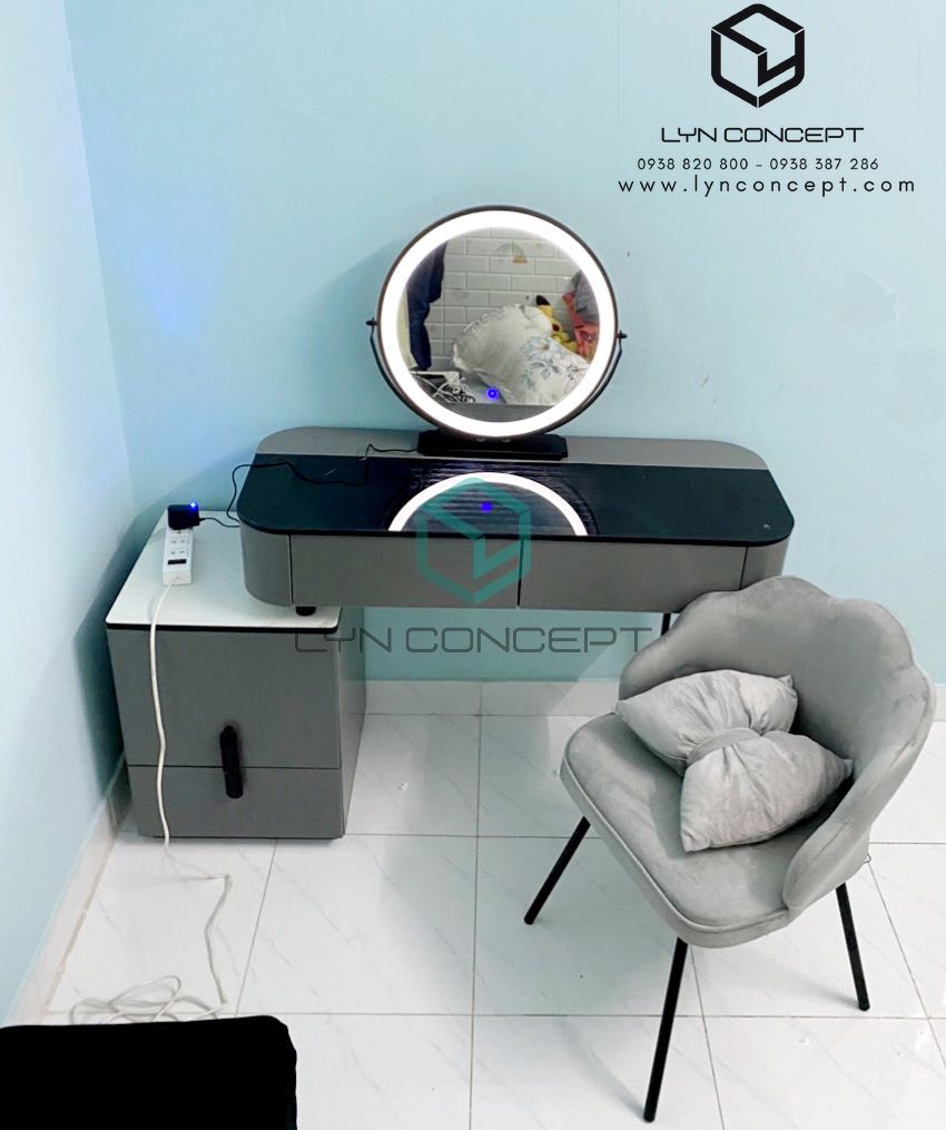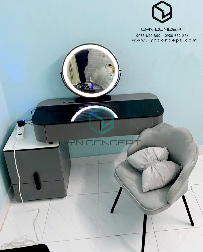 + Bàn trang điểm bằng gỗ sơn màu xám mờ, mặt kính màu đen sang trọng. Chân sắt sơn màu đen.