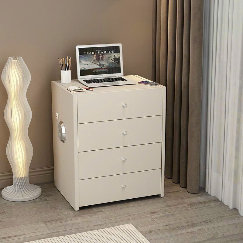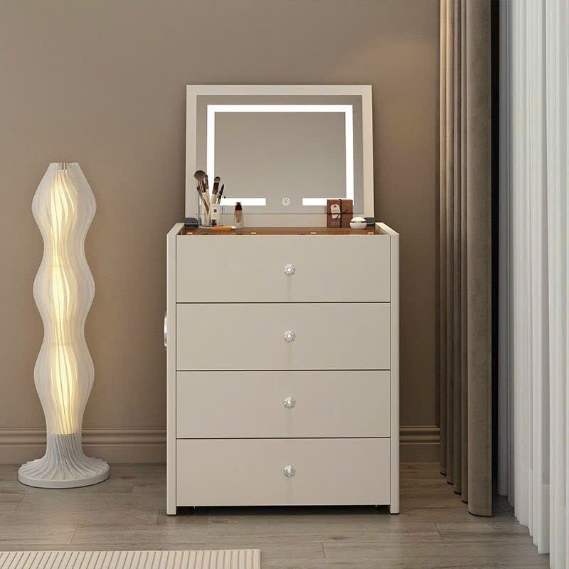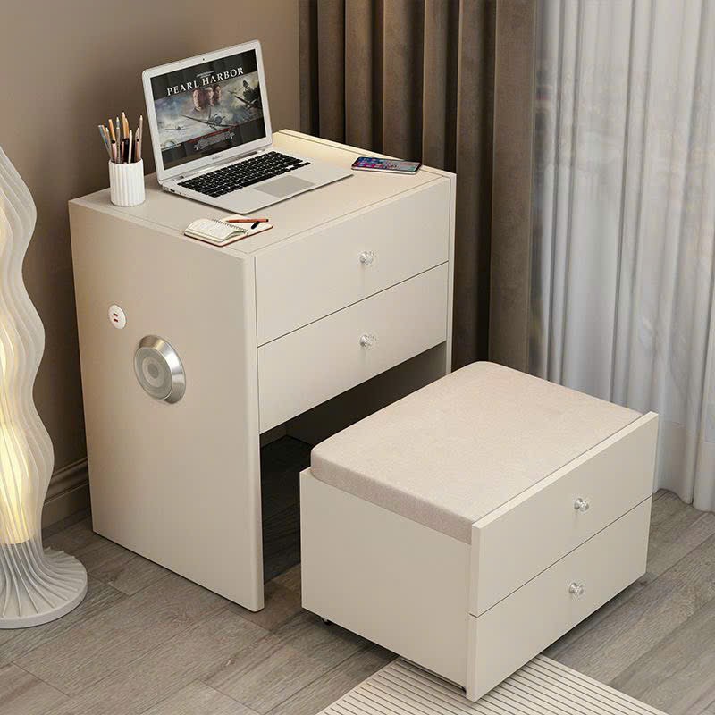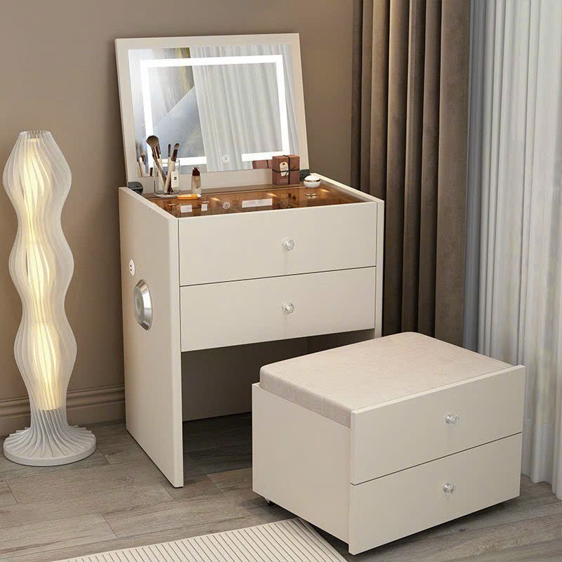 + Bàn trang điểm bằng gỗ màu trắng, mặt bàn kính nâu sang trọng. Tích hợp tính năng thông minh loa Bluetooth, ổ cắm USB.