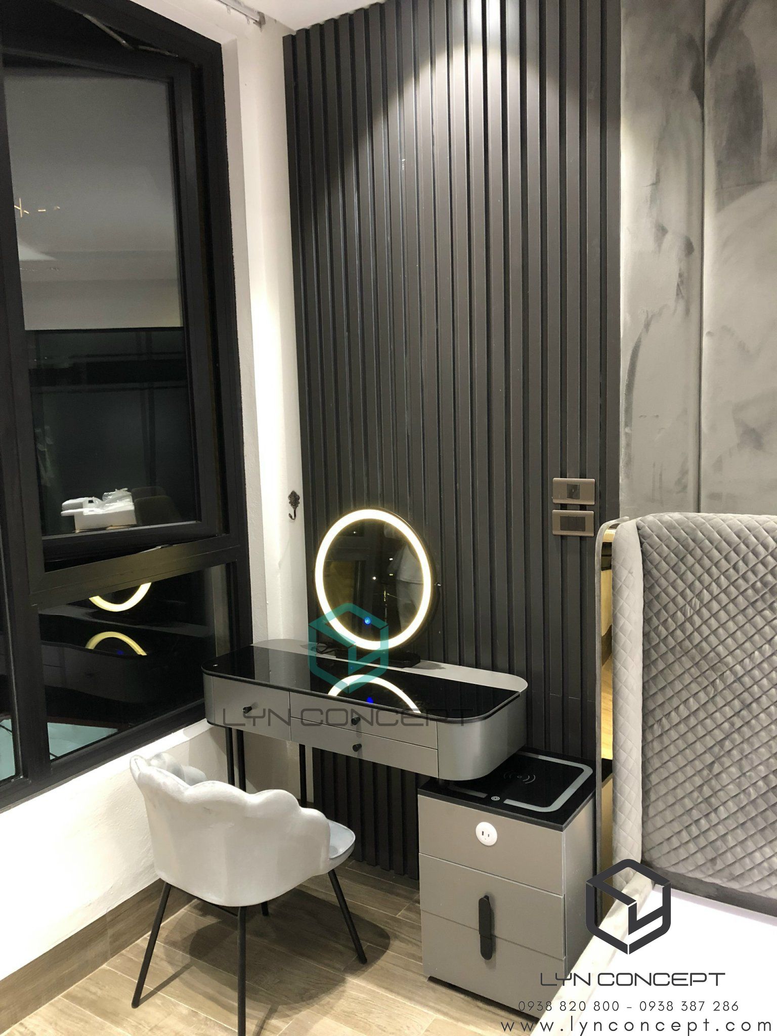 + Bàn trang điểm bằng gỗ sơn màu xám. Chân sắt sơn màu đen.