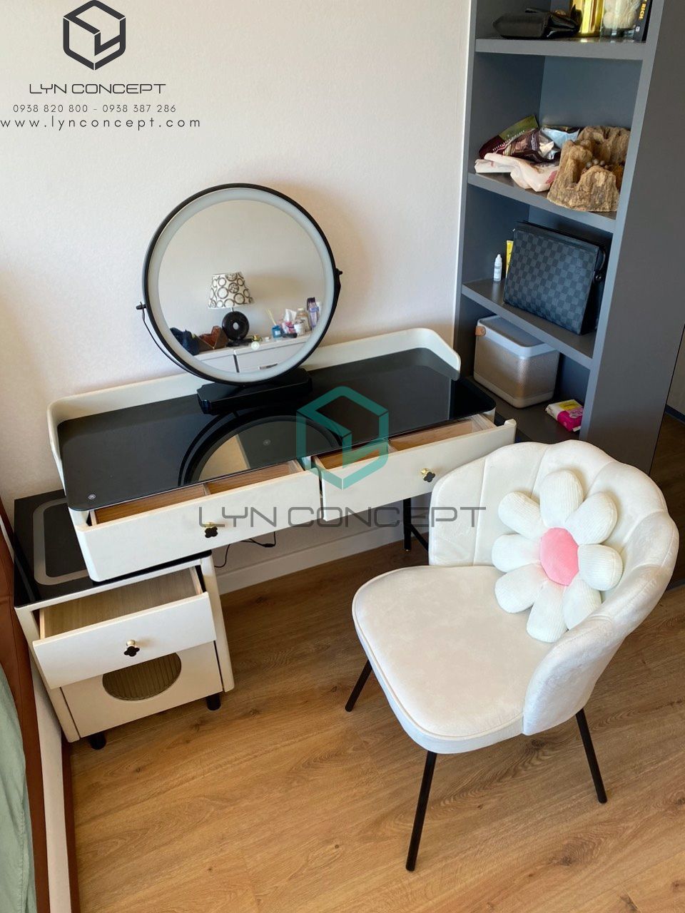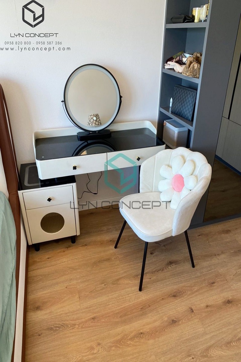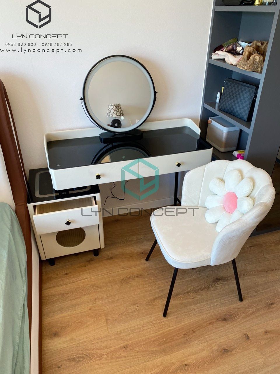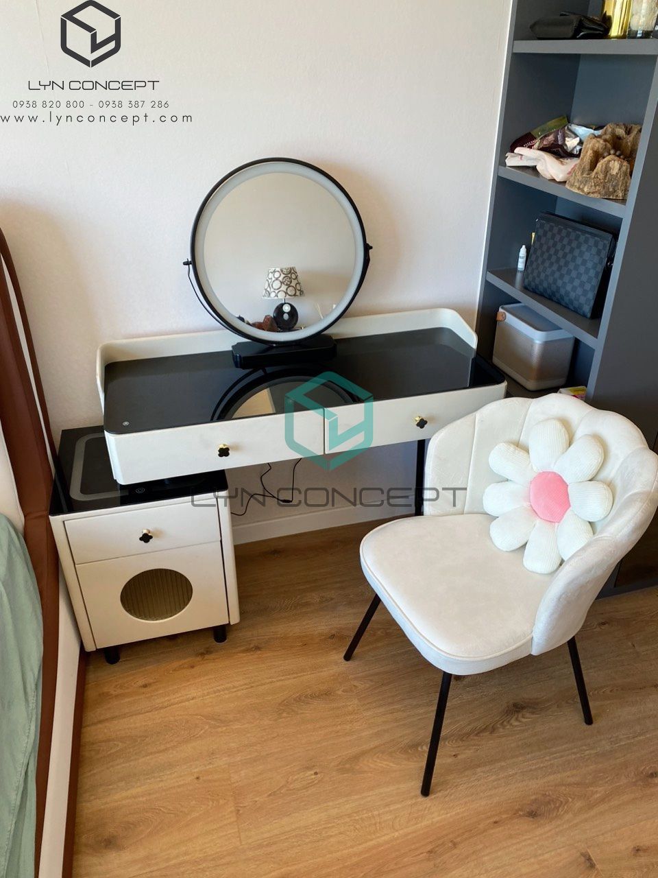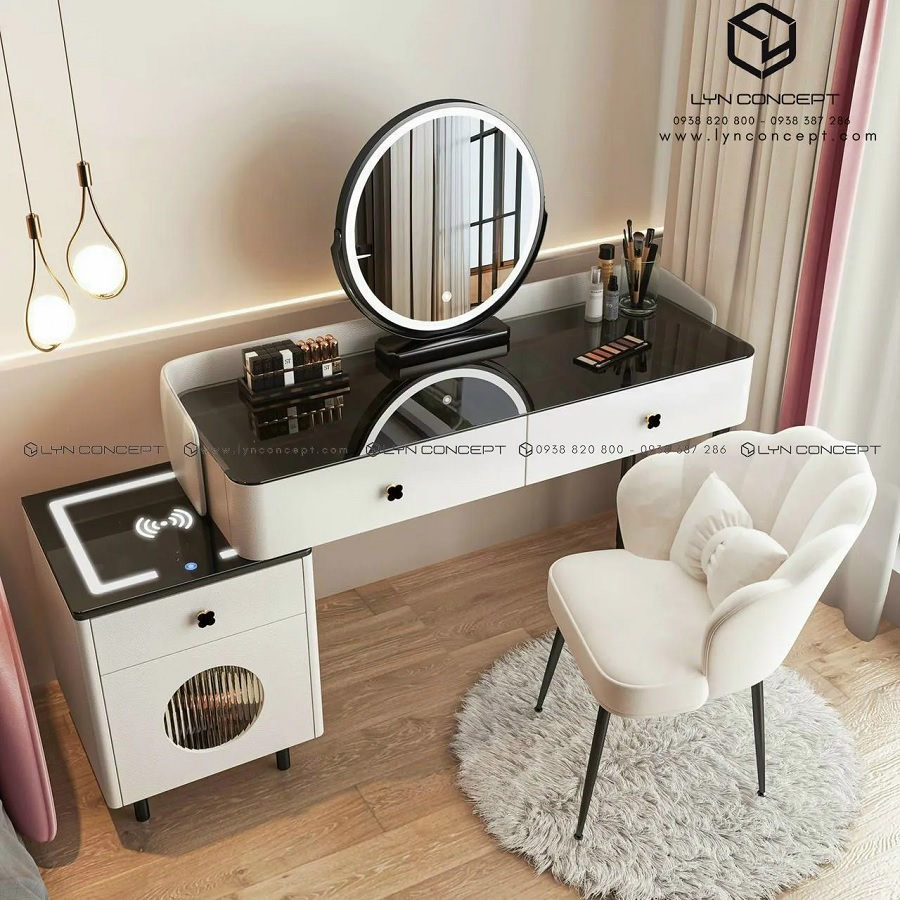 + Bàn trang điểm bằng gỗ bọc da màu trắng cao cấp, mặt kính đen. Chân sắt sơn đen.