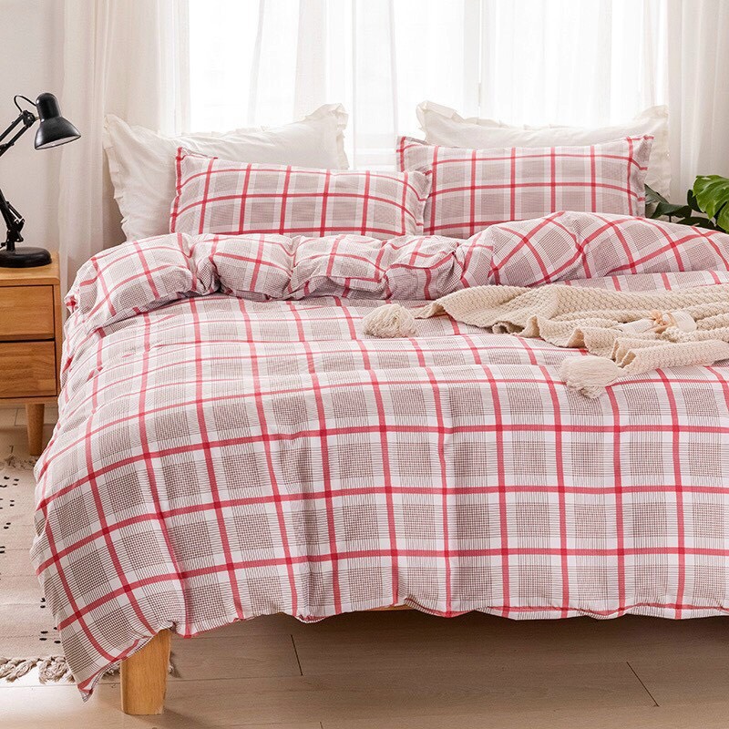 Bộ Chăn Ga Gối 5 Món Cotton Poly Hàn Quốc In Hình Caro Phối Trên Nền Màu Trắng Hồng - CP35