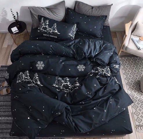 Bộ Chăn Ga Gối 5 Món Cotton Poly Hàn Quốc In Hình Cây Thông Và Hoa Tuyết Phối Trên Nền Màu Xanh Đen- CP49