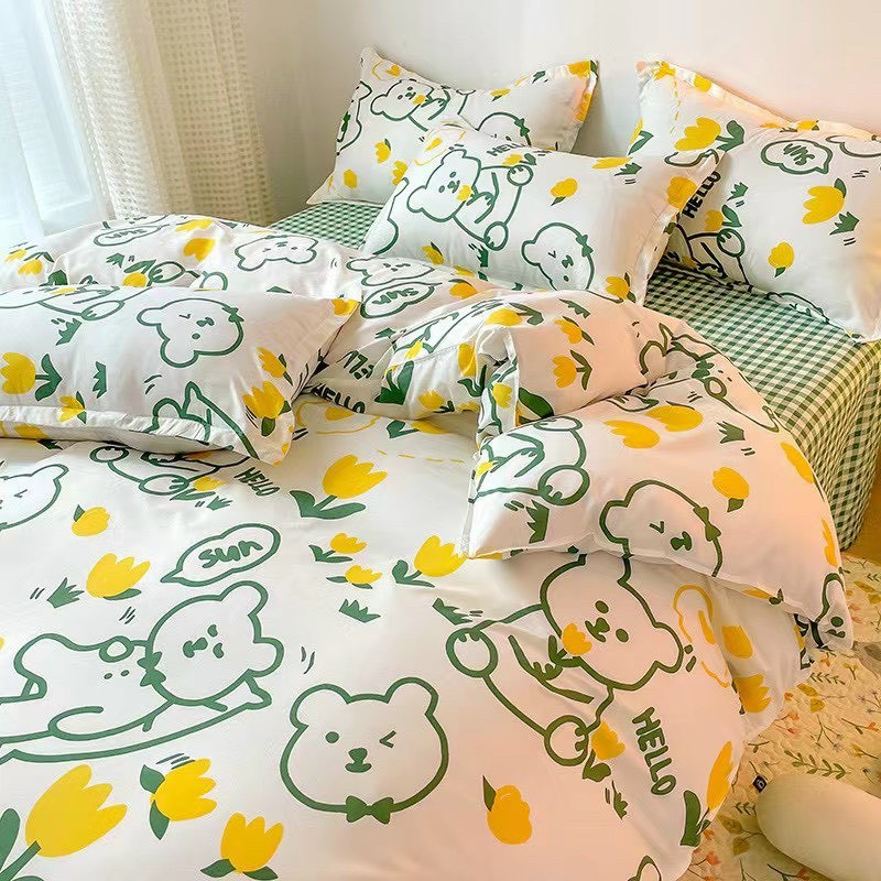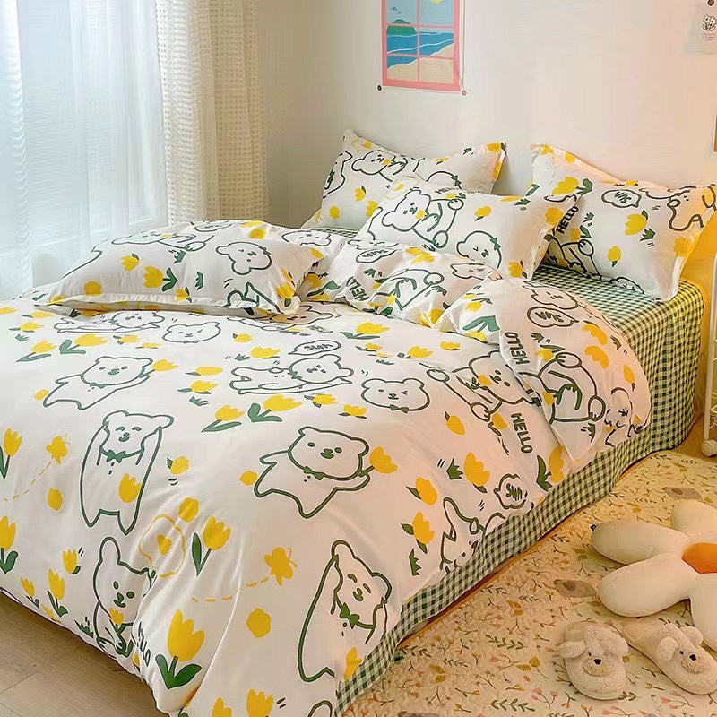 Bộ Chăn Ga Gối 5 Món Cotton Poly Hàn Quốc In Hình Con Gấu Xanh Phối Nền Màu Trắng Xanh - CP14