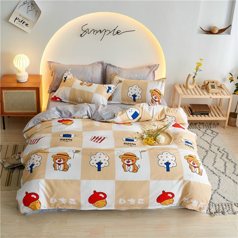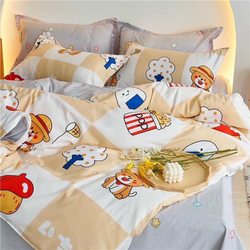 Bộ Chăn Ga Gối 5 Món Cotton Poly Hàn Quốc In Hình Gấu Và Cây Phối Nền Màu Trắng Vàng Nhạt - CP31