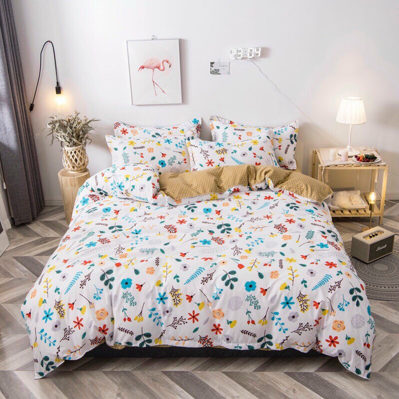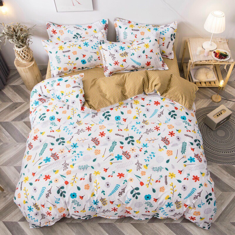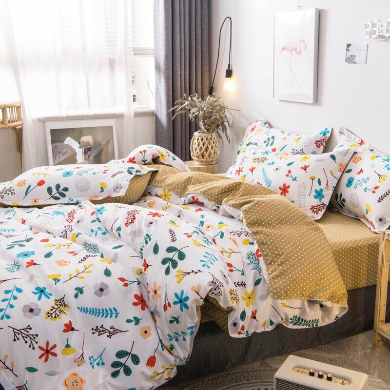 Bộ Chăn Ga Gối 5 Món Cotton Poly Hàn Quốc In Hình Hoa Lá Phối Nền Màu Trắng Vàng - CP18