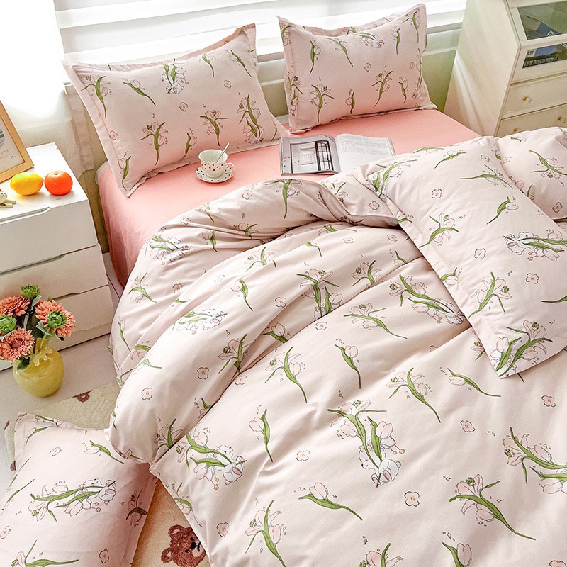 Bộ Chăn Ga Gối 5 Món Cotton Poly Hàn Quốc In Hình Hoa TuLip Phối Trên Nền Hồng Nhạt - CP102
