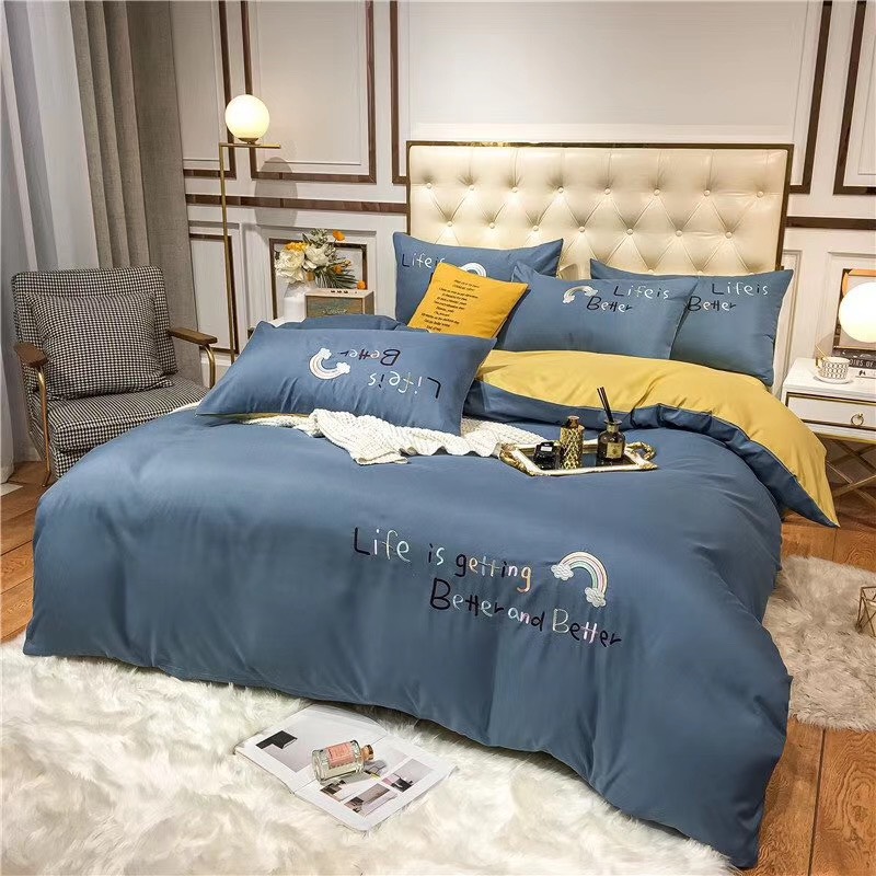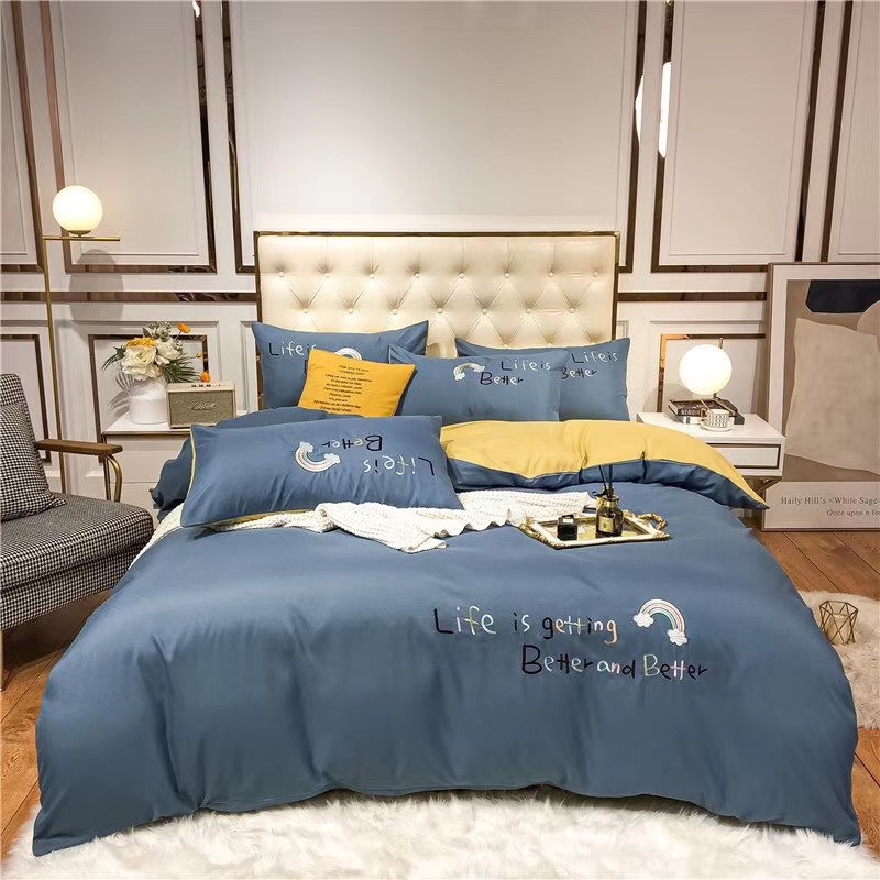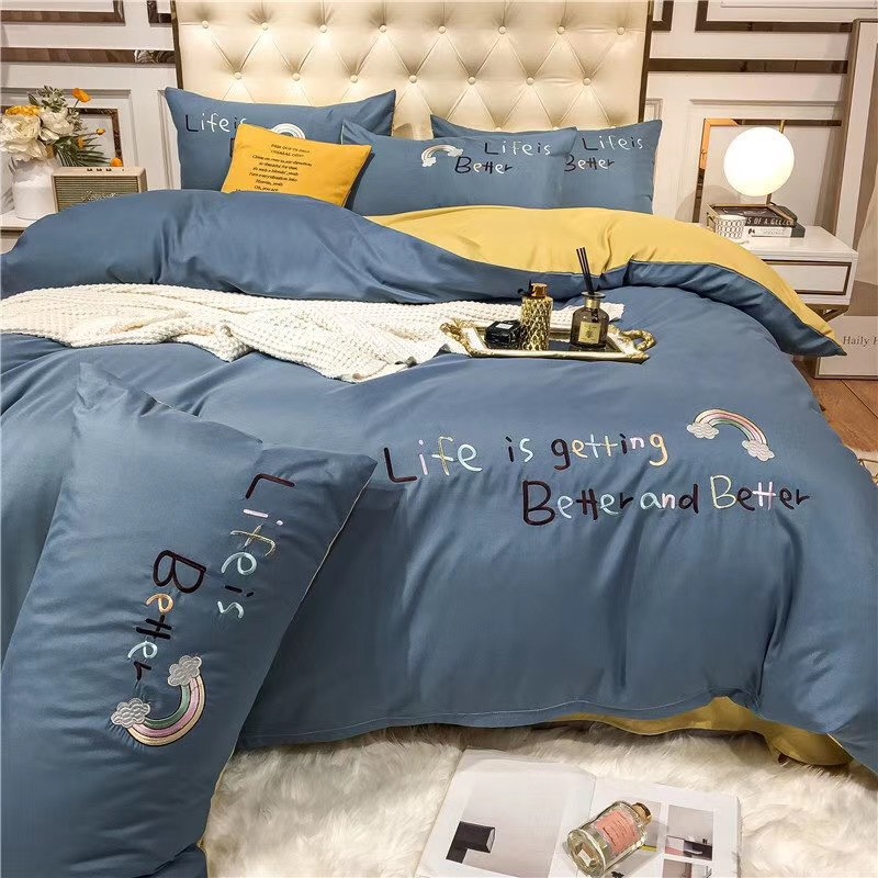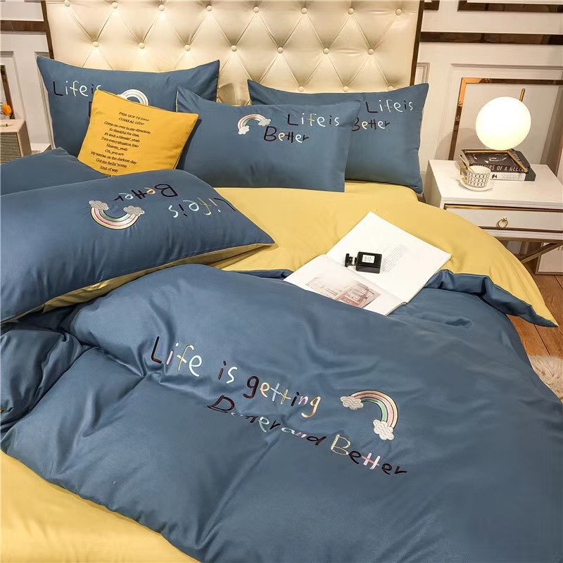 Bộ Chăn Ga Gối Cotton 30s Hàn Quốc In Hình Cầu Vồng Phối Trên Nền Màu Xanh Đen - CT30S.02