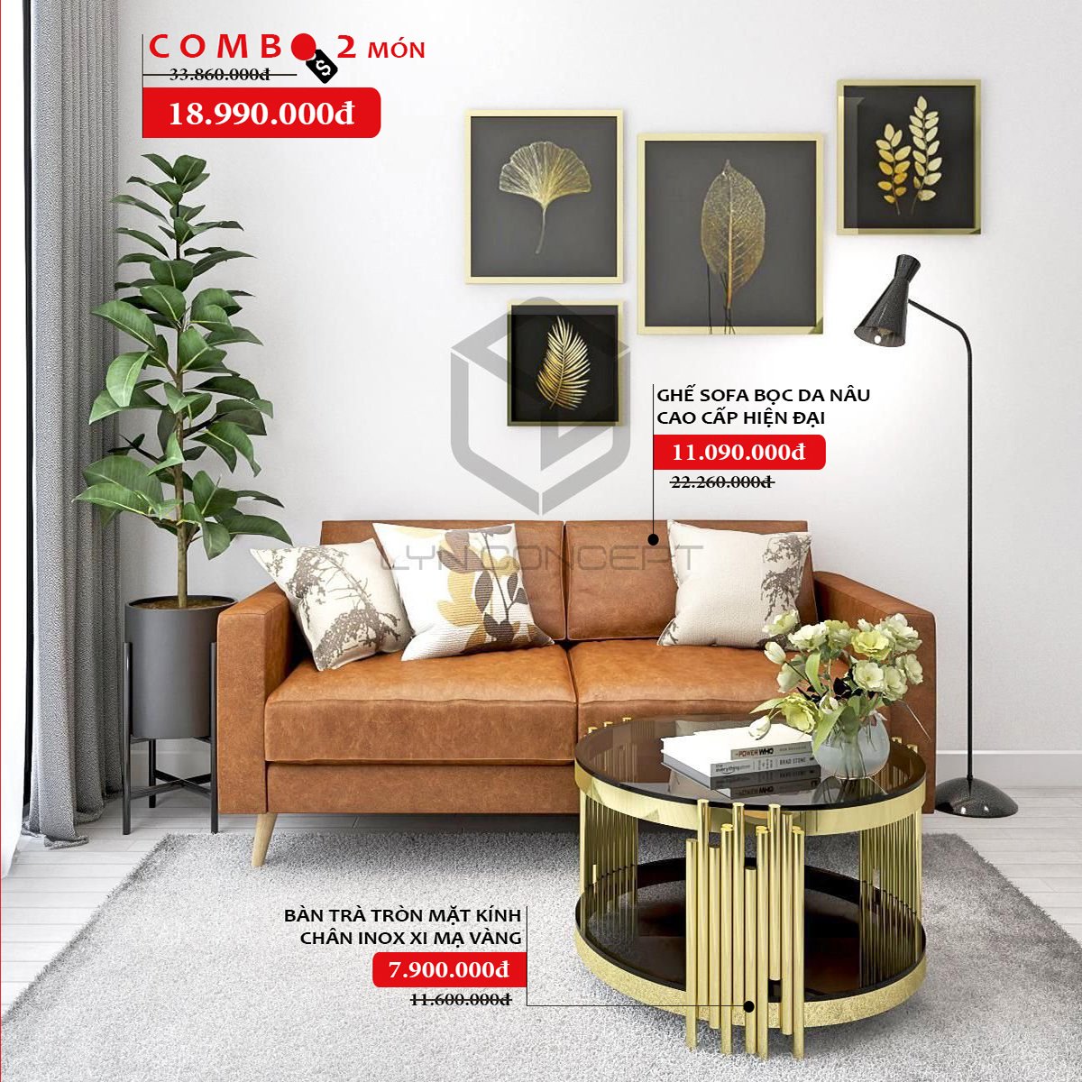 Combo nội thất phòng khách đẹp tại LYN Concept thường bao gồm các nội thất như: ghế sofa, bàn trà sofa, bàn góc sofa, tủ tivi, kệ trang trí..... , kiểu dáng sang trọng và tiện nghi, phong cách hiện đại, thích hợp cho không gian nội thất chung cư, nhà phố hiện đại.