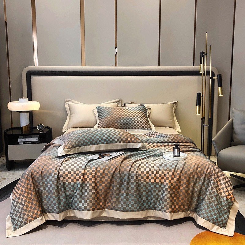 Bộ Chăn Ga Gối Lụa Thái Cao Cấp Màu Xanh Phối Cam In Hình Ô Vuông Chất Liệu Mềm Mịn Sang Trọng - LT15
