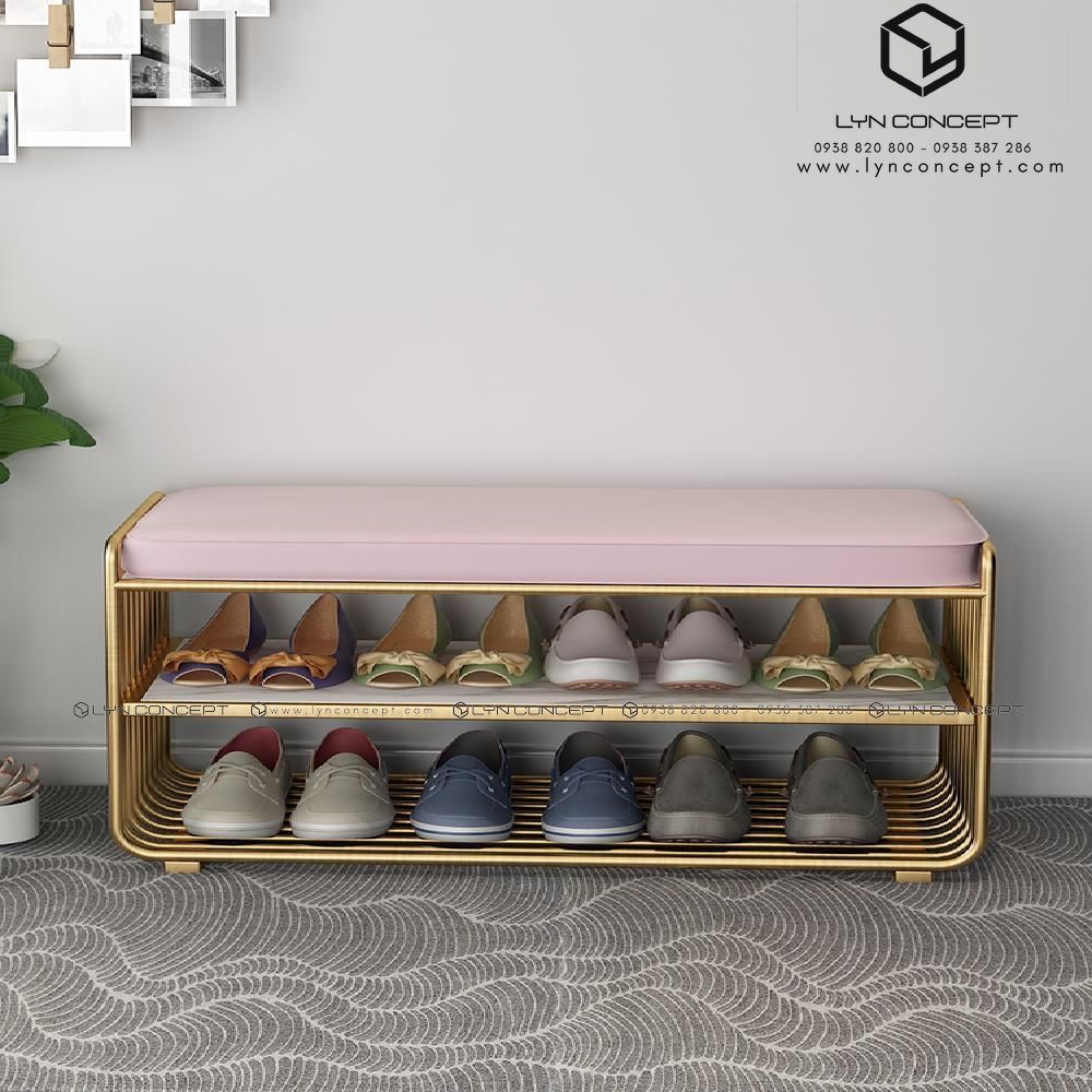 Ghế Ngồi Mang Giày 2 Tầng Màu Hồng Ngọc Chân Sắt Sơn Vàng - GMG18.4
