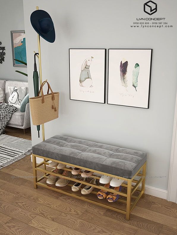 Ghế Ngồi Mang Giày Kèm Thanh Treo Nón Màu Xám Chân Sắt Sơn Vàng - GMG16.2
