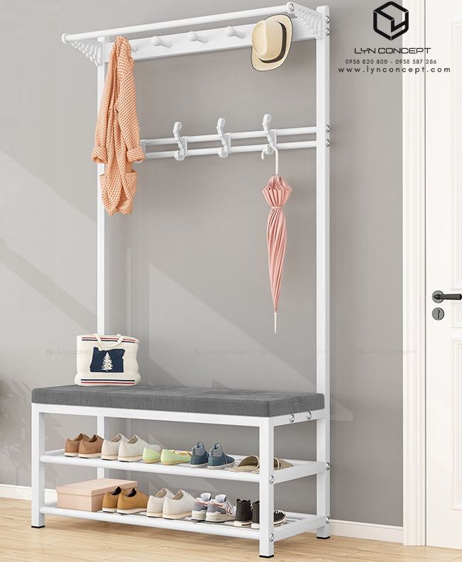 Ghế Ngồi Mang Giày Kèm Thanh Treo Quần Áo Màu Xám Chân Sắt Trắng - GMG14A.5