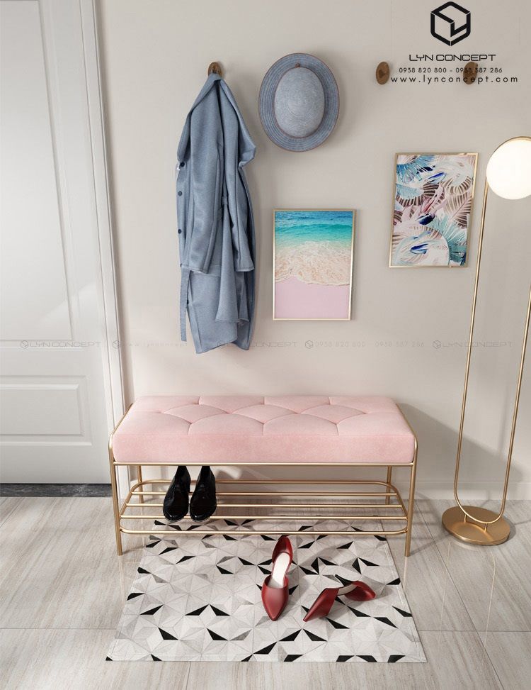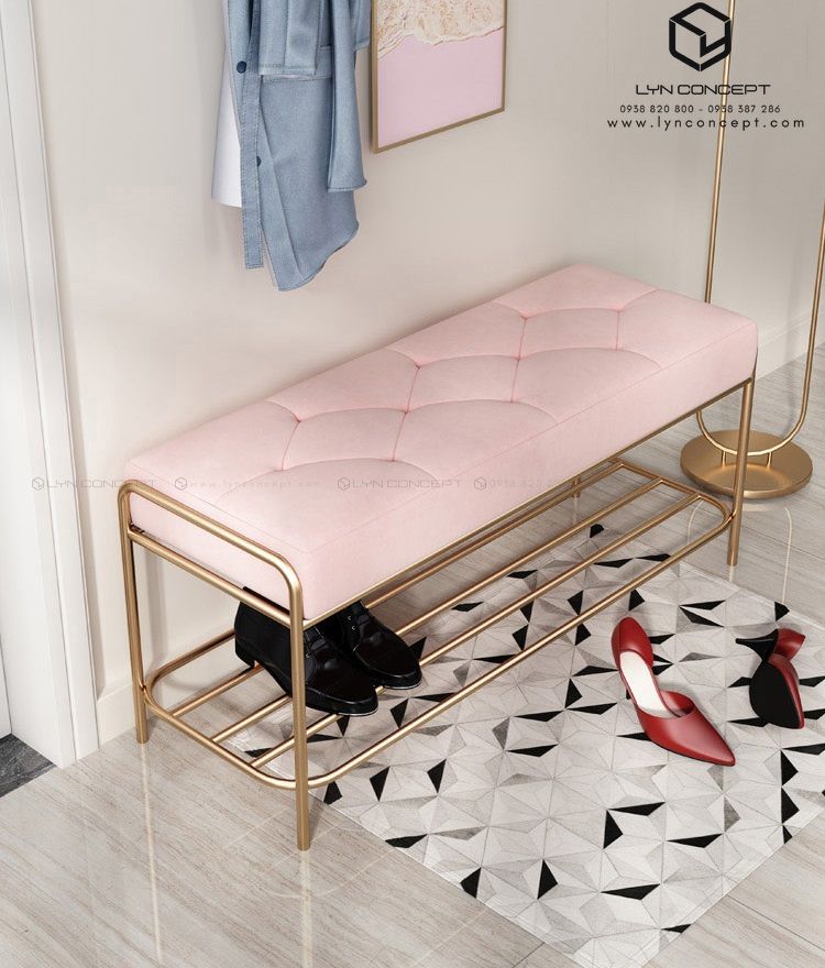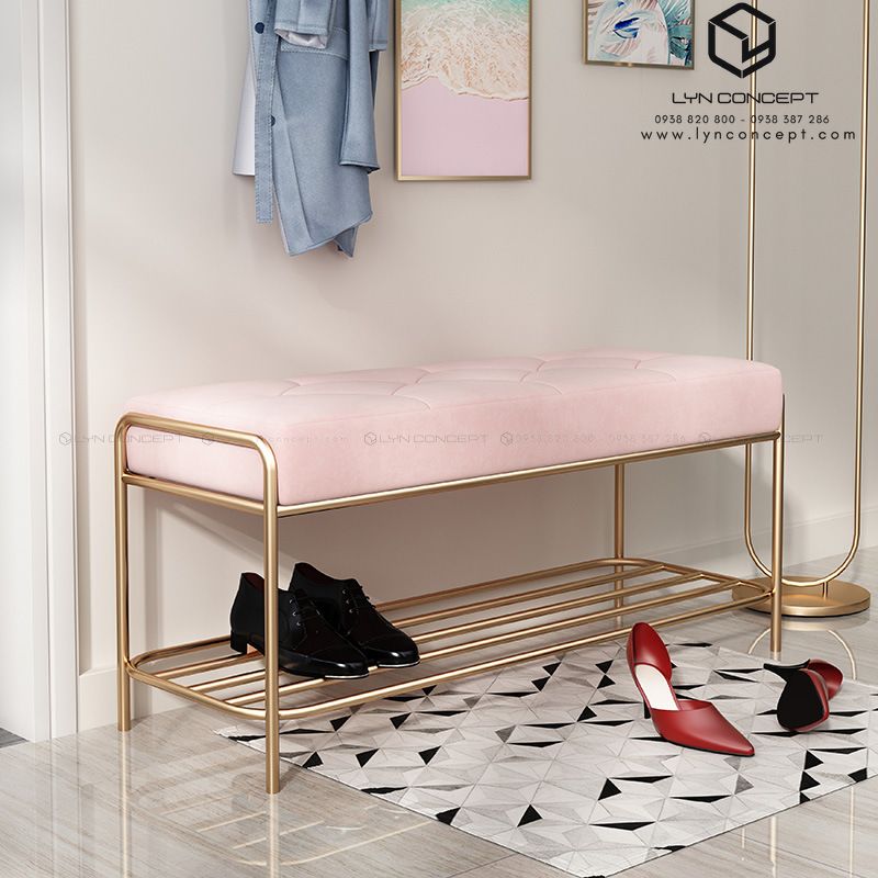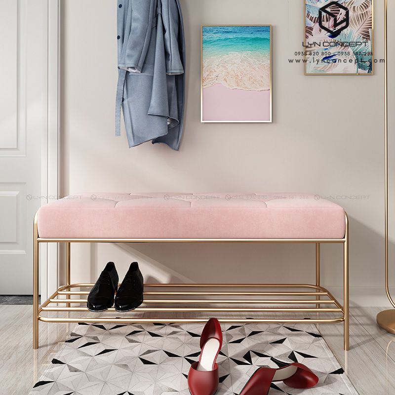 Ghế Ngồi Mang Giày Màu Hồng Chân Sắt Vàng - GMG03.1