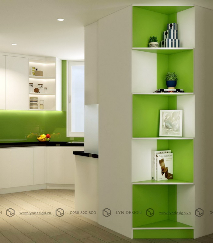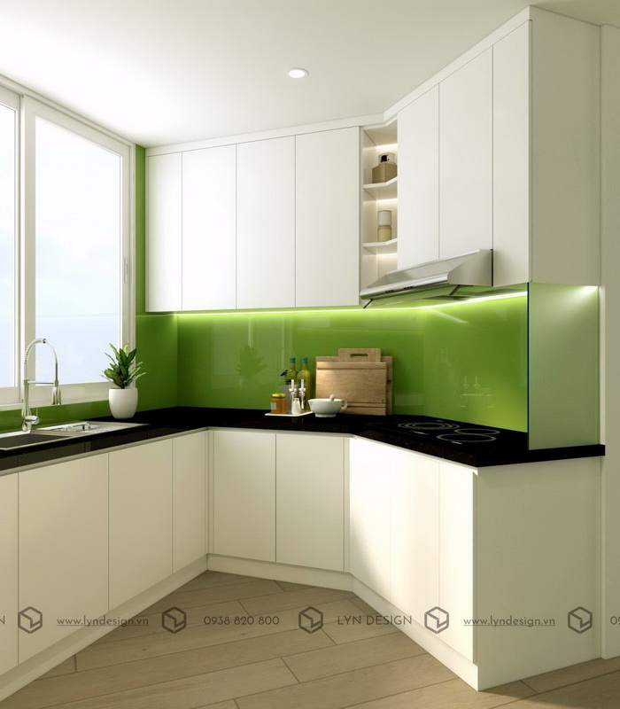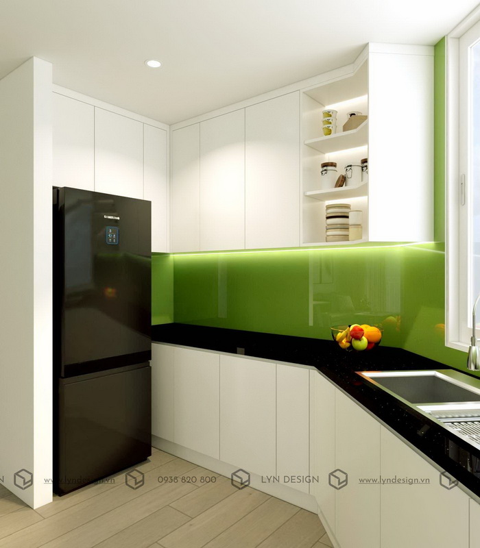 Thiết kế bếp sử dụng kính ốp sơn màu xanh lá nổi bật tạo điểm nhấn bắt mắt cho bếp kế hợp cùng màu trắng tinh khôi nhã nhặn cũng góp phần khiến không gian phòng bếp trở nên gần gũi và ấm cúng hơn.