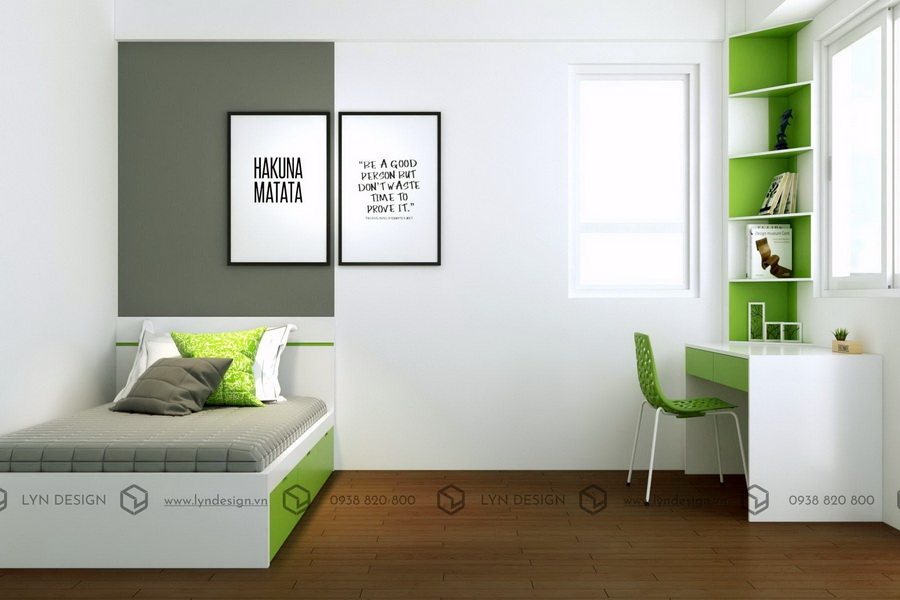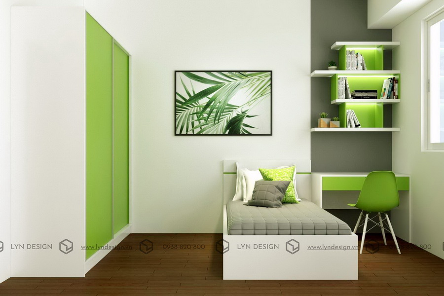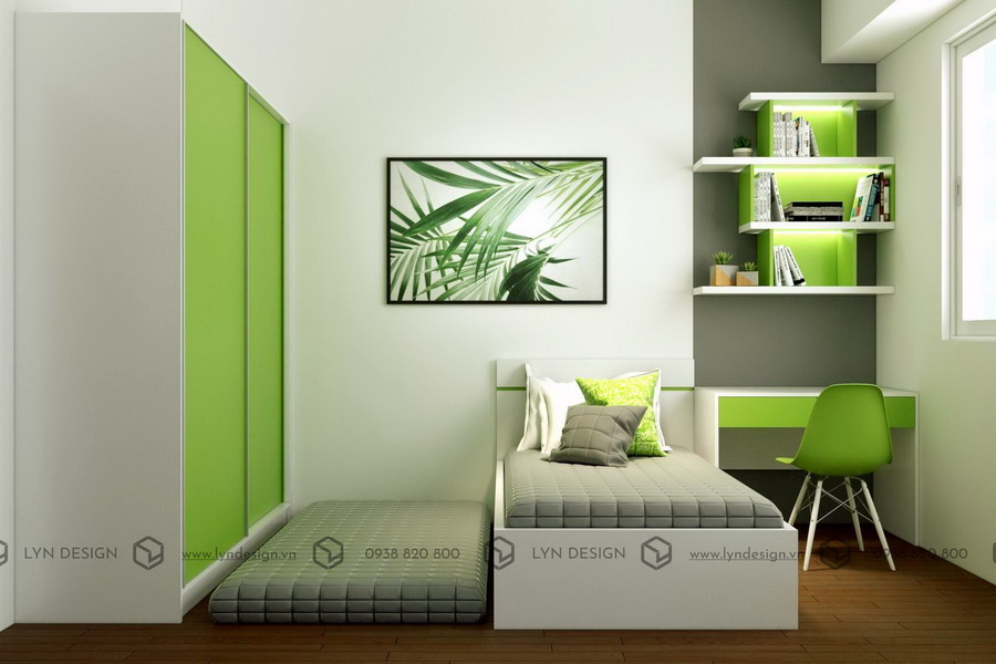 Sự đơn giản và tiện dụng lên ngôi cho những căn hộ có hạn chế về diện tích thì căn phòng này sử dụng một chiếc giường nhỏ, không chiếm quá nhiều diện tích trong phòng mà còn khoác lên vẻ hiện đại. Đối với phòng ngủ master KTS sử dụng màu xanh lá làm gam màu chính trong thiết kế nội thất phòng ngủ kết hợp cùng điểm nhấn của mảng sơn màu xám ngày vách đầu giường giúp cho căn phòng hài hòa và bớt nhàm chán hơn. Ngoài ra, giường ngủ được thiết kế với phần hộc tủ dưới gầm để gia chủ có thể sắp xếp đồ đạc vào bên trong, vừa tối ưu diện tích sử dụng, vừa tăng tính thẩm mỹ cho nội thất phòng.