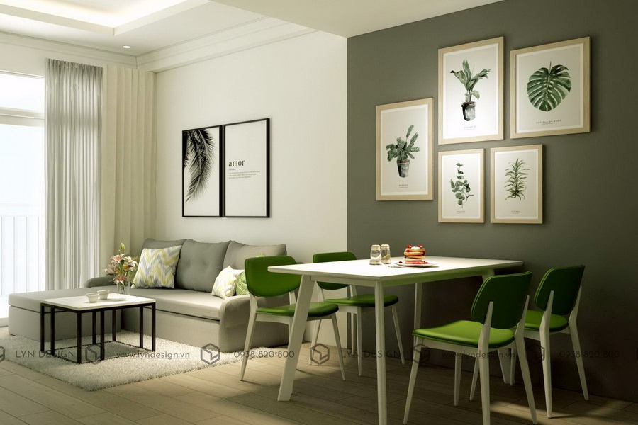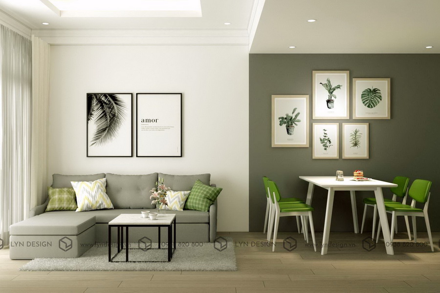 Trong căn hộ 73m2, đôi vợ chồng trẻ chọn phong cách trang trí đơn giản, gọn gàng nhưng cũng rất sang trọng.Với không gian diện tích khiêm tốn LYN Design đã khéo léo sắp xếp bằng cách tạo không gian mở cho khu vực phòng khách và khu vực bếp đặt cạnh nhau. Bộ bàn ăn với thiết kế hiện đại nhỏ gọn tiết kiệm không gian sử dụng nổi bật hơn với tone xanh bắt mắt tạo nên tổng thể không gian mang màu sắc trẻ trung, hiện đại để phù hợp với sở thích của các thành viên trong gia đình. Hiệu quả cải thiện mở rộng gian bếp được thấy rõ. Mà không làm tốn thêm diện tích cho các khu vực khác.