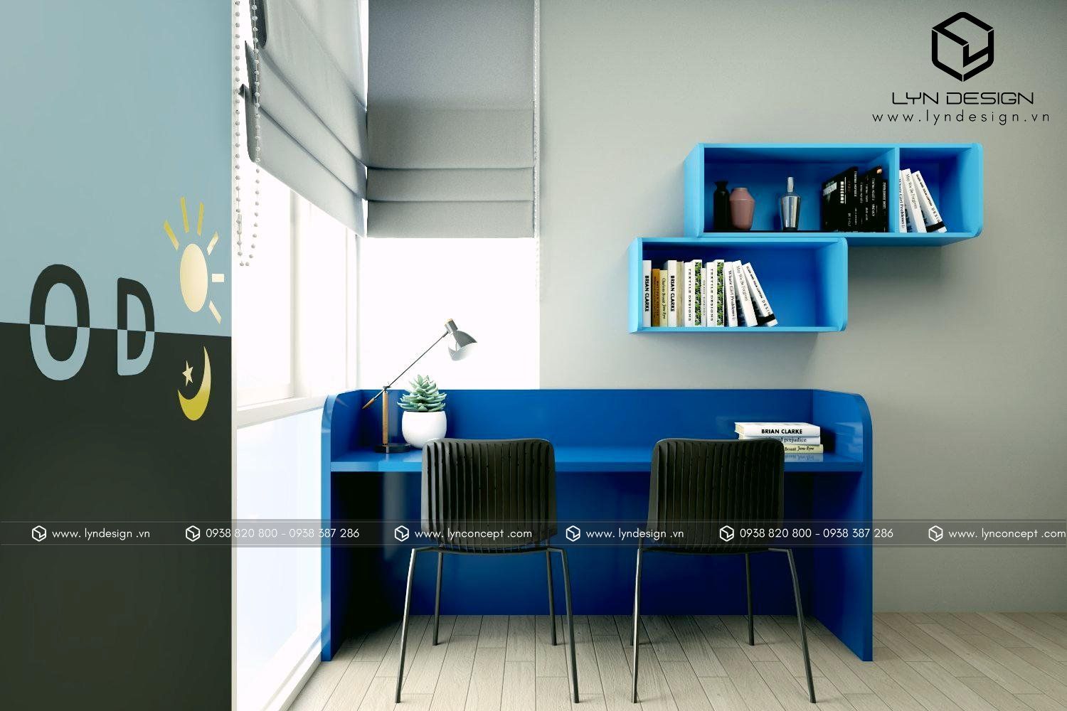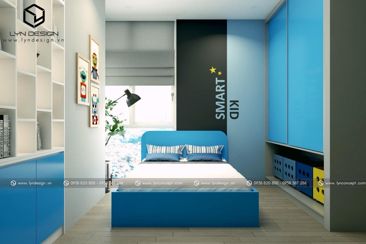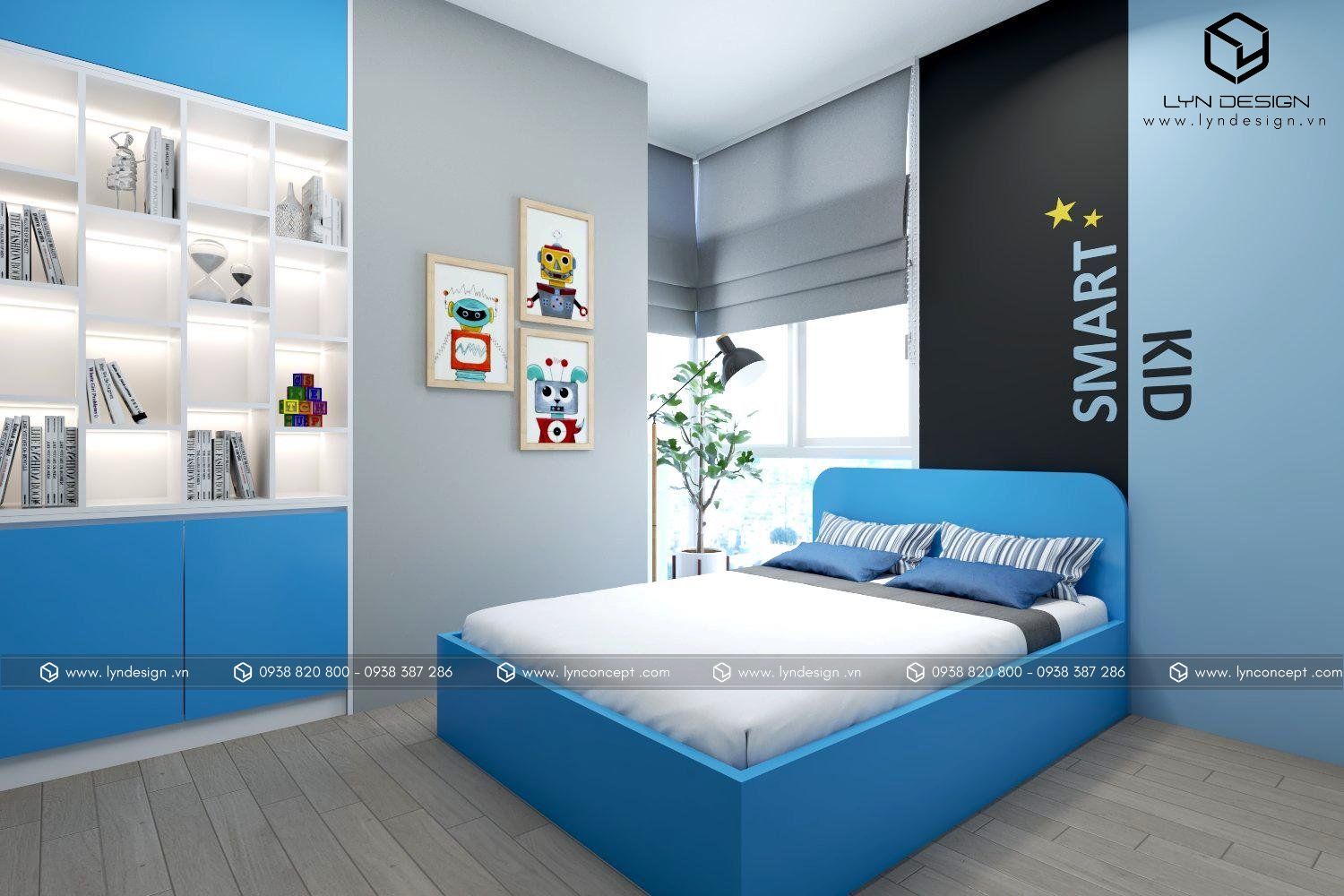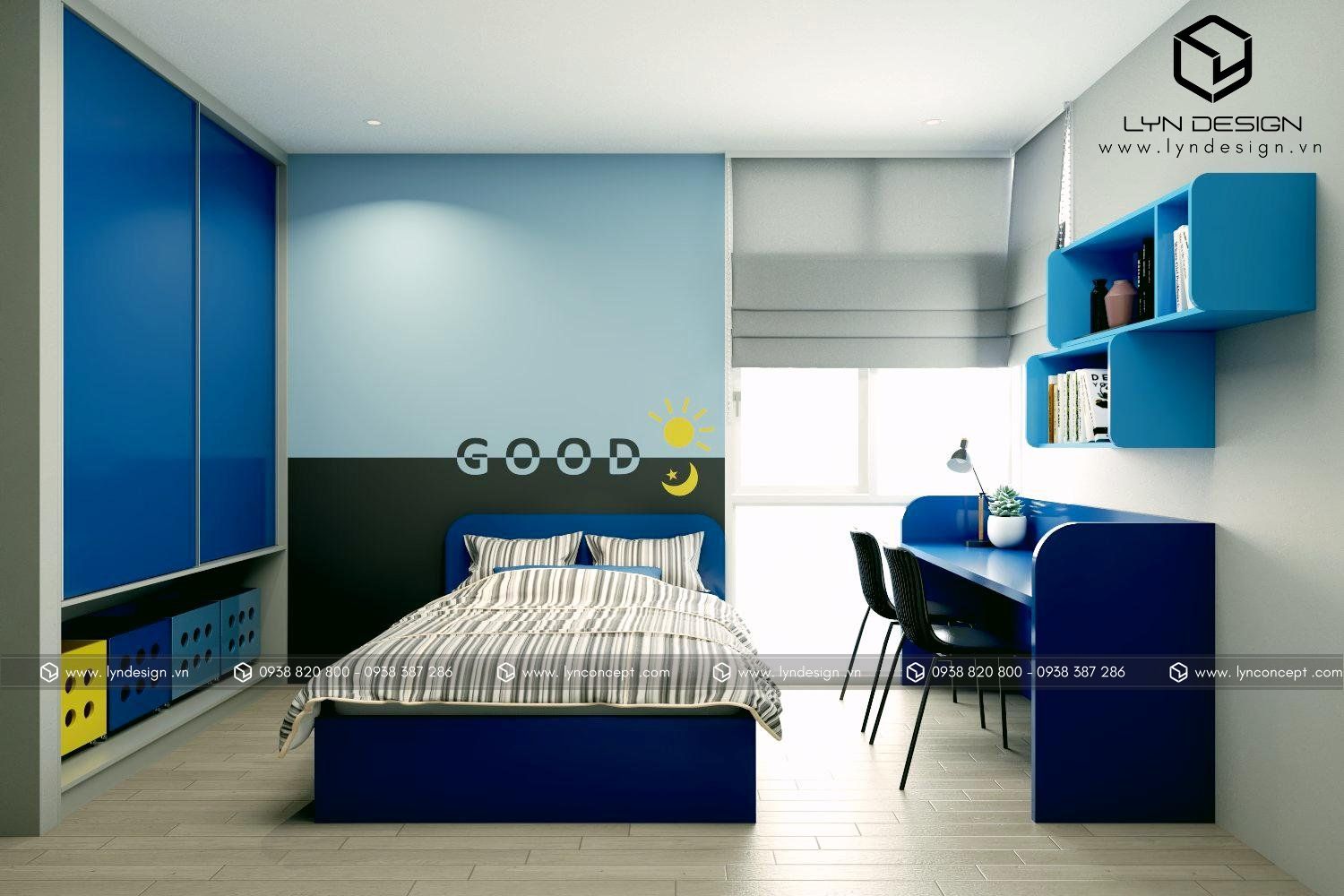 Phòng ngủ cho bé trai được decor theo phong cách ngộ nghĩnh đáng yêu phù hợp với lứa tuổi. Với gam màu xanh tươi mát giúp căn phòng thêm sáng hơn. Vì căn phòng trẻ em có diện tích nhỏ nên KTS không đưa quá nhiều đồ dùng nội thất vào, chỉ sử dụng những đồ cần thiết như giường ngủ, bàn học, kệ sách, tủ áo. KTS sử dụng các đồ dùng nội thất thông minh với thiết kế đẹp mắt vừa dễ dàng sử dụng, vừa tạo nên nét thẩm mỹ cho toàn bộ căn phòng.