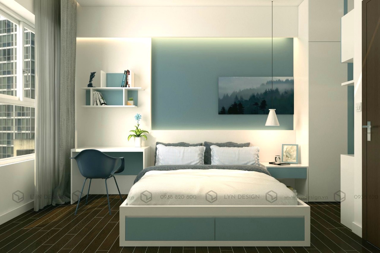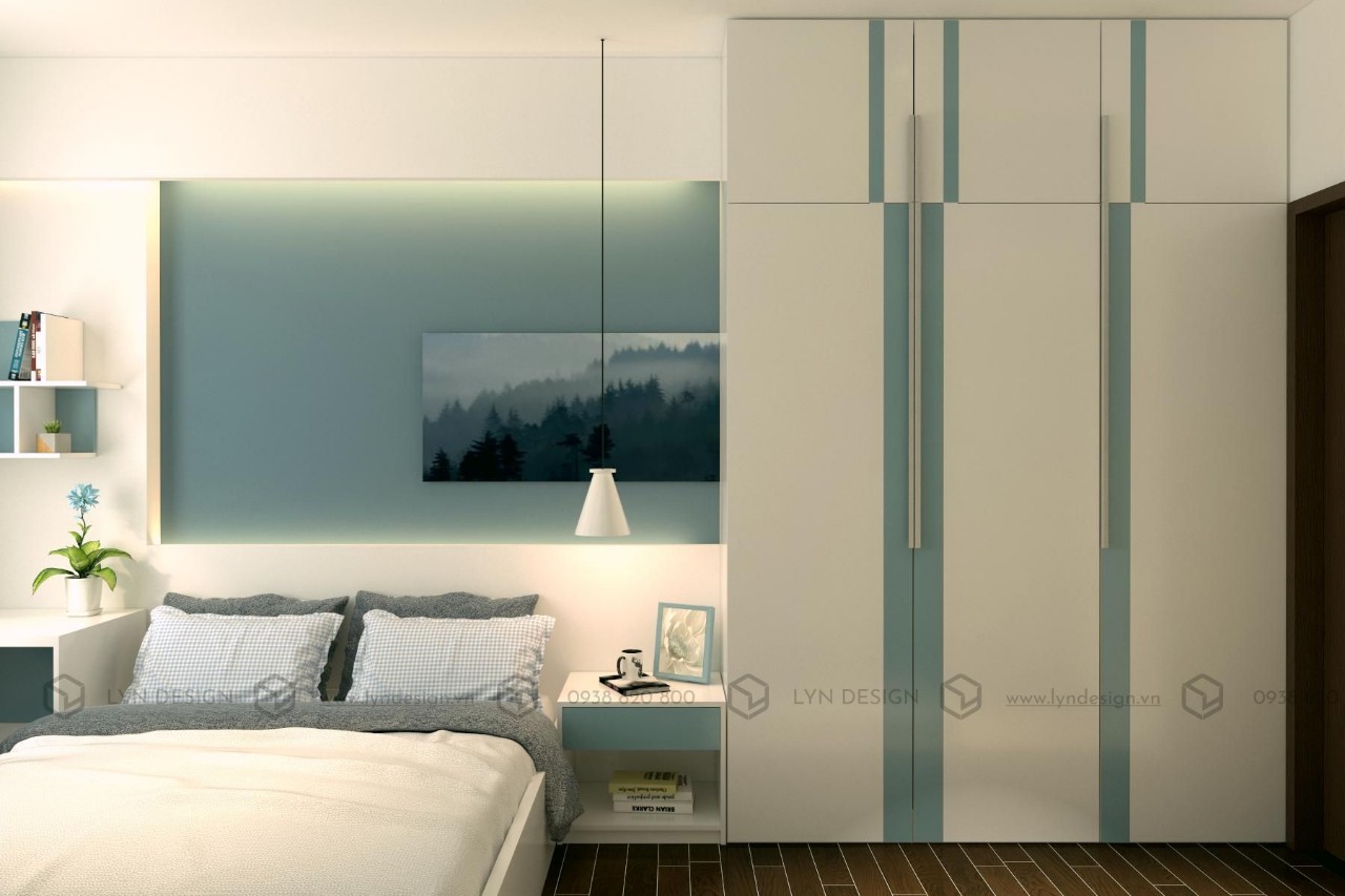 Màu xanh ngọc là màu xanh được chủ nhà yêu thích và lựa chọn cũng đem lại sự thư thái cho người sự dụng. Kết hợp cùng chất liệu gỗ, phòng ngủ được tăng thêm sự ấm áp và đảm bảo yếu tố phong thủy phòng ngủ.