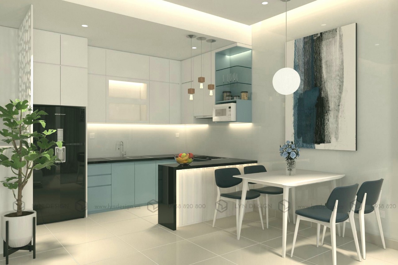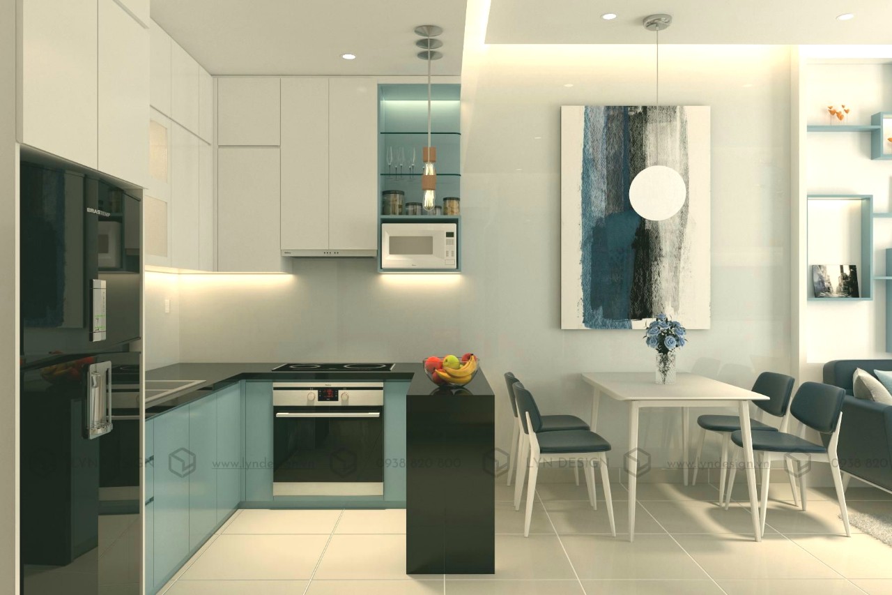 Do diện tích dành cho bếp không quá rộng nên phương án sử dụng bếp cơ bản được ưu tiên. Thay vì xây đảo bếp, LYN Design tư vấn thiết kế quầy bar như một phương án thay thế vừa trẻ trung, hiện đại lại giúp ngăn chia không gian với bàn ăn và khu nấu nướng cực kỳ hiệu quả.