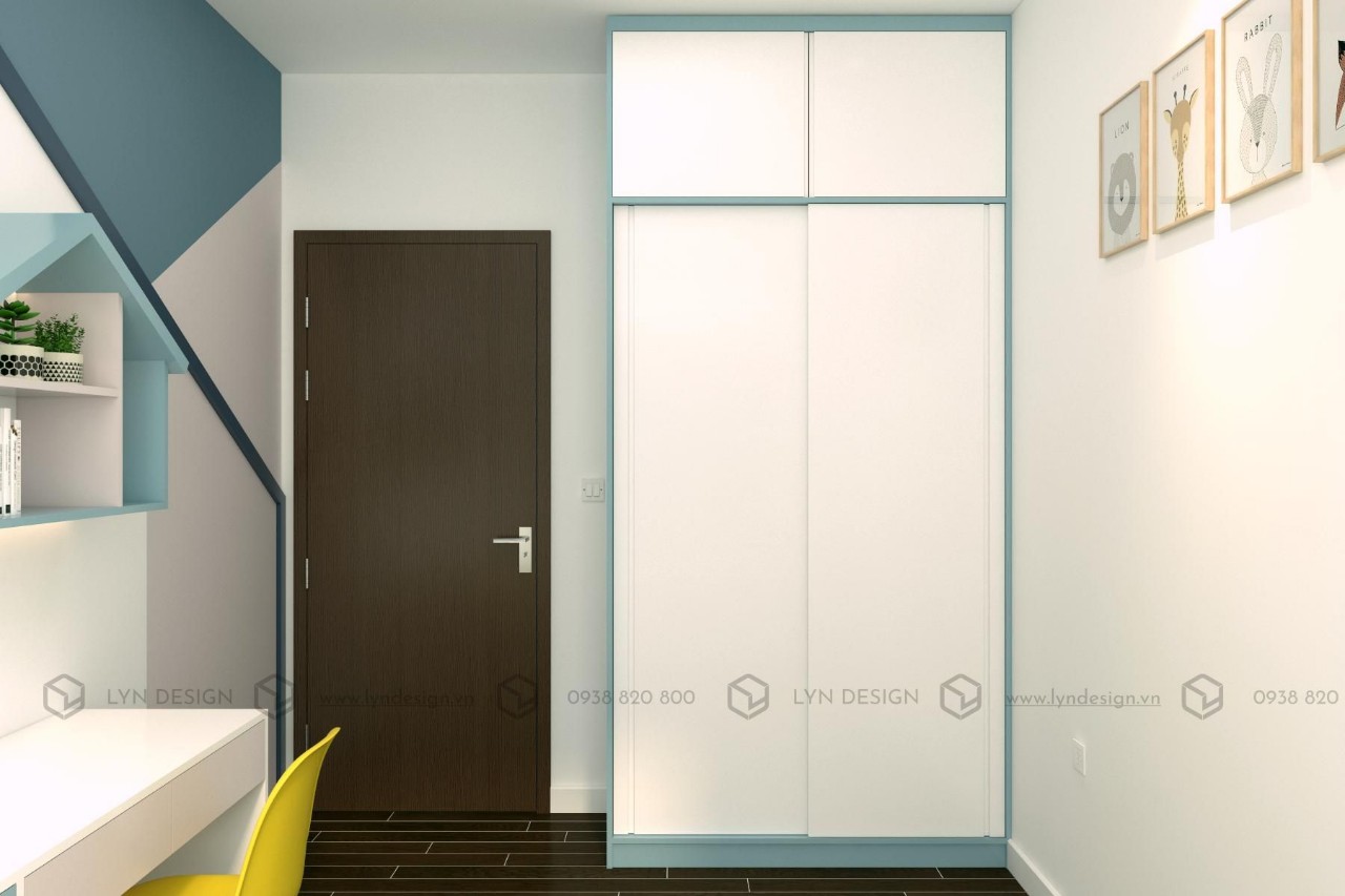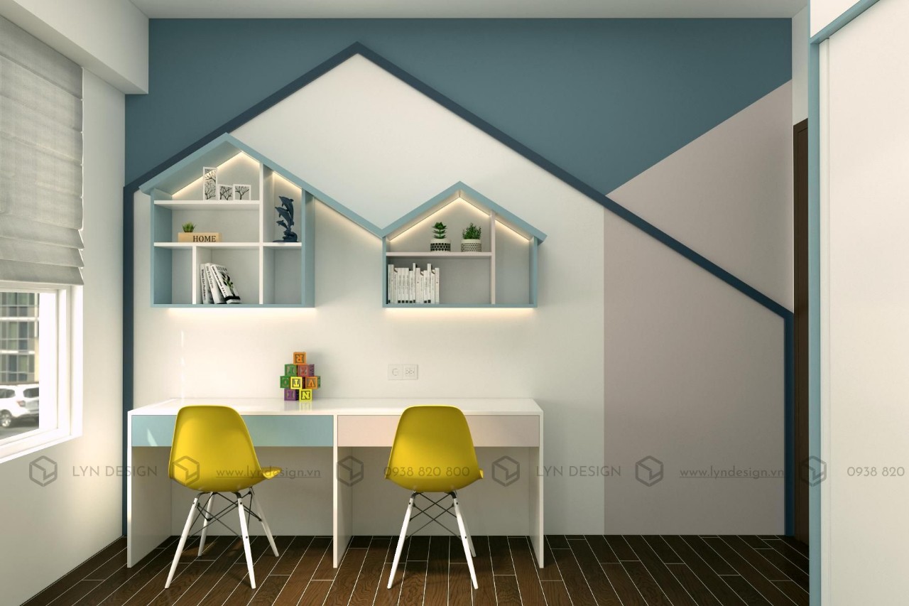 Chú trọng vào tư vấn thiết kế nội thất thiên về tiện ích nhiều hơn chi tiết trang trí, thiết kế nội thất phòng ngủ của bé được bố trí nhiều kệ để bé thoải mái đựng sách vở, đồ dùng học tập. Màu sắc sử dụng nhẹ nhàng đặc trưng như hồng phấn, xanh da trời để có thể linh động thay đổi phong cách khi bé lớn lên.