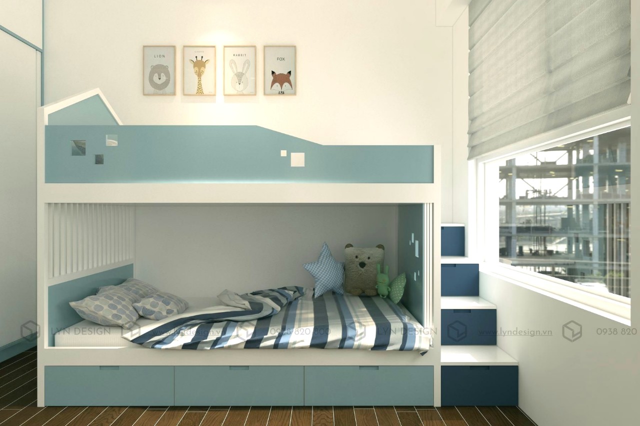 Chiếc giường 2 tầng có tông màu xanh ngọc nhẹ nhàng, mát mẻ giúp trẻ con thích thú hơn với căn phòng và tăng diện tích vui chơi cho trẻ