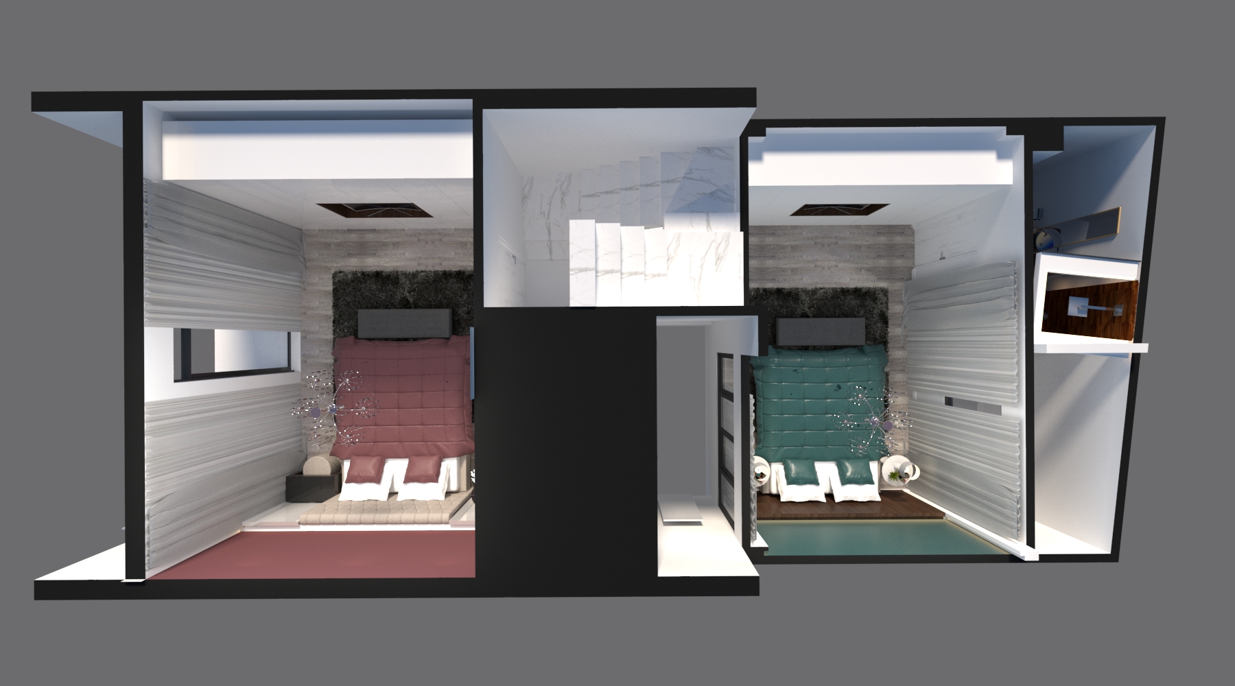 Gam màu xám – xanh dương và màu của gỗ là những màu sắc chính của căn phòng.Gỗ là vật liệu không thể thiếu trong không gian với vách gỗ đầu giường được bọc simili cao cấp và kệ đầu giường bằng gỗ. Màu xám cho mảng tường đầu giường được sử dụng giấy dán tường hiện đại thêm phần cá tính và mạnh mẽ cho không gian..