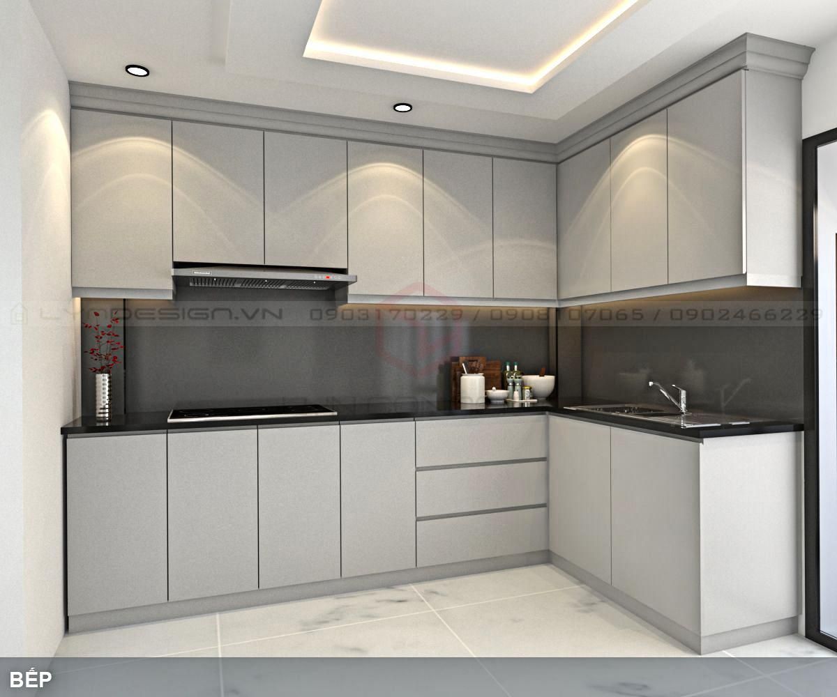 Không gian phòng khách có phong cách thiết kế hiện đại. bếp chữ L bo sát tường tạo không gian trống