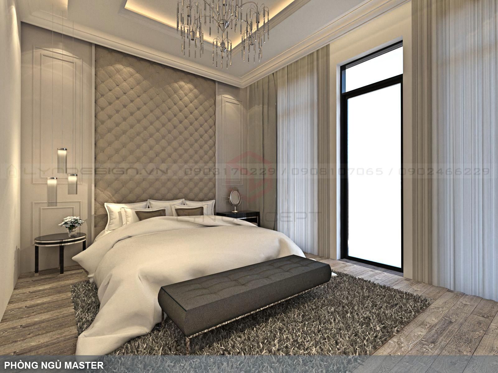 Phòng ngủ được thiết kế theo phong cách hiện đại pha chút tân cổ điển, gam màu trắng và màu của gỗ là những màu sắc chính của căn phòng.