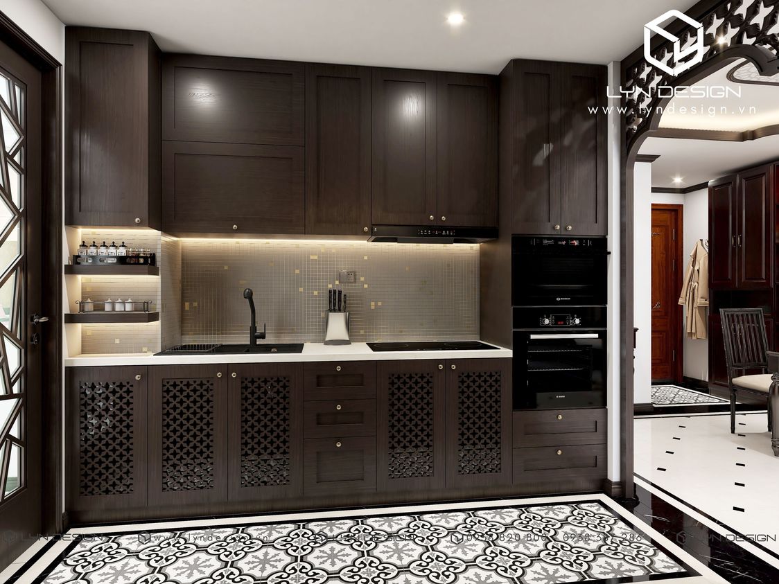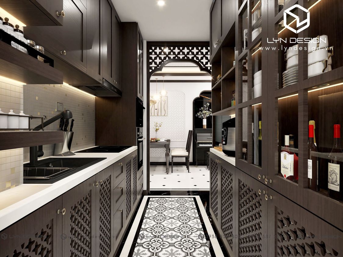Mẫu tủ bếp chữ I hiện đại tiện dụng với người nội trợ được xem là giải pháp thiết kế nội thất phòng bếp cho chung cư hiện nay. Bên cạnh đó việc sử dụng hệ thống đèn trang trí phòng bếp hiện đại tạo nên sự tinh tế và đầy ấm cúng làm nổi bật các họa tiết Indochine đầy lãng mạn.