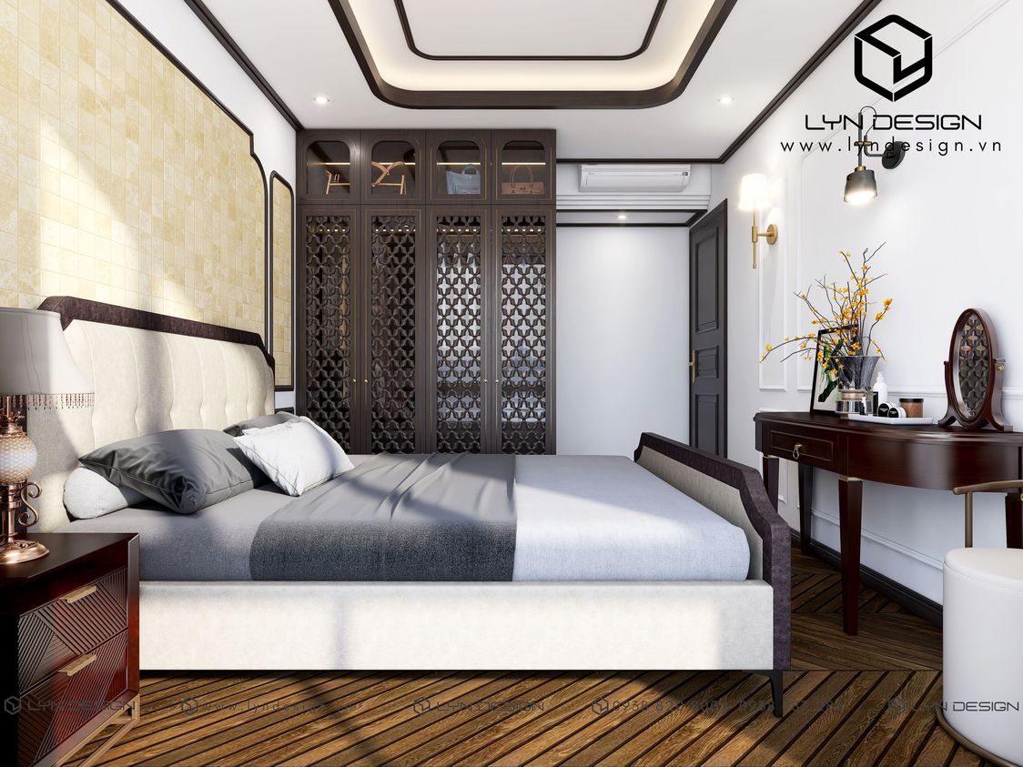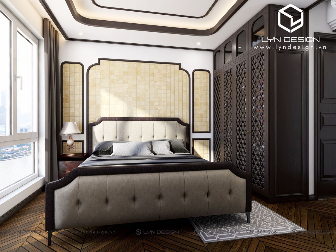 Điều làm nên sự xa hoa nhưng vẫn tràn đầy tính thẩm mỹ nghệ thuật của phòng ngủ là hệ tủ quần áo bằng chất liệu gỗ cánh chạy CNC với họa tiết cổ điển mang nét đẹp của không gian xưa và biến hoá phong cách Indochine trở nên sang trọng hơn.