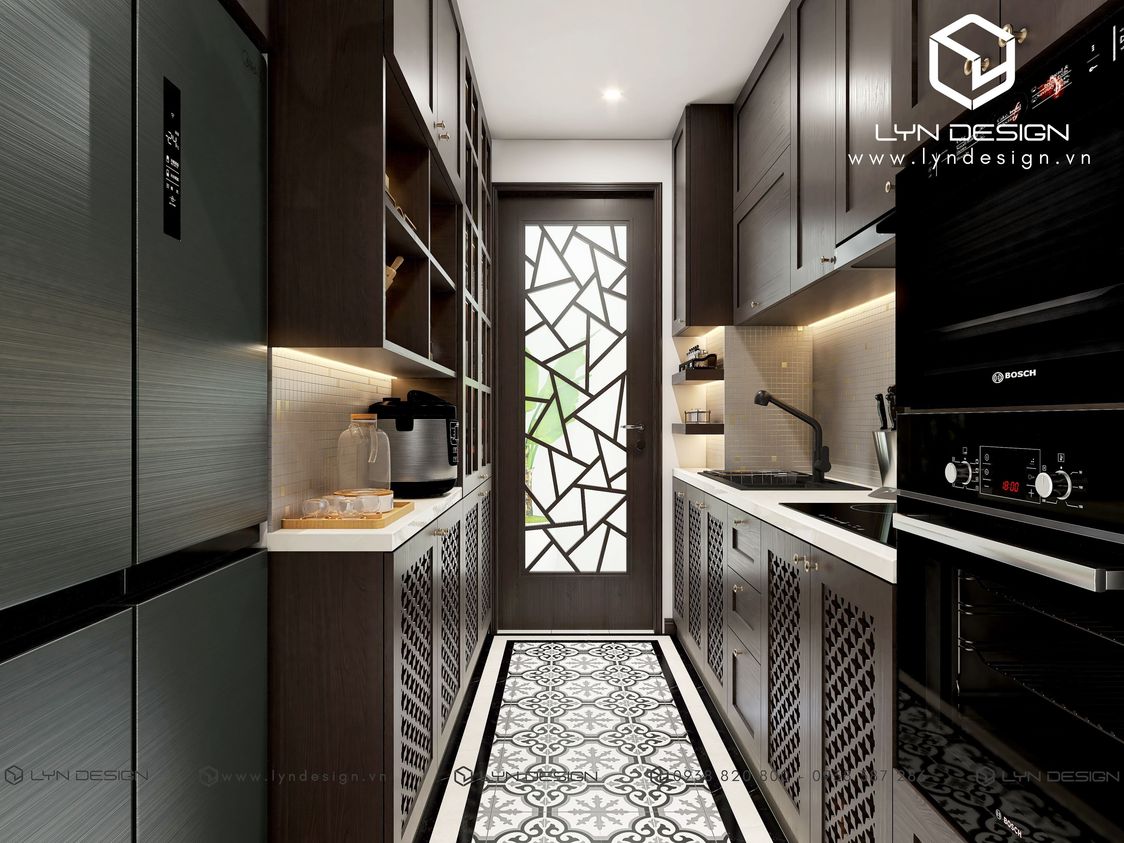 Qua khu vực phòng khách tiếp đến bếp, kiến trúc sư đã thổi hồn vào khu vực bếp bằng hệ tủ bếp chất liệu gỗ công nghiệp sơn PU chống ẩm, gạch nung hoa văn cổ điển trắng đen kết hợp đồ gia dụng hiện đại theo tông màu nâu đặc trưng của phong cách Indochine. Căn bếp trở nên nhẹ nhàng, đầy cảm hứng mà vẫn đảm bảo công năng vốn có.