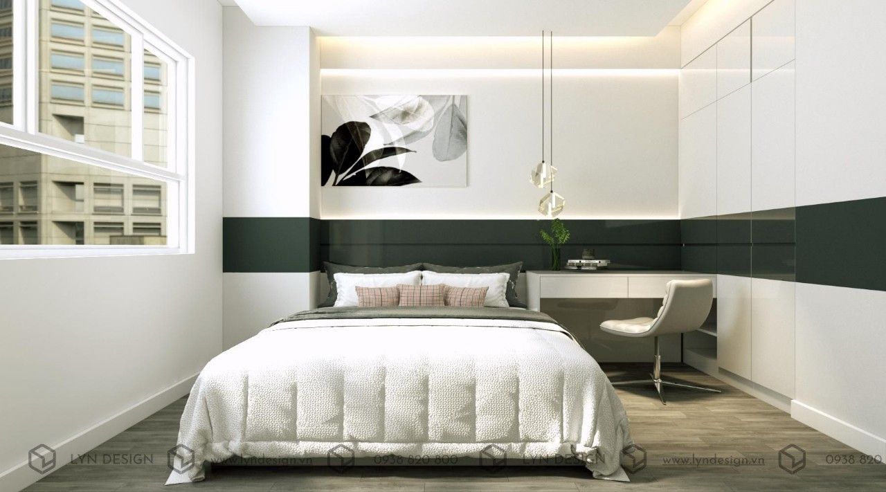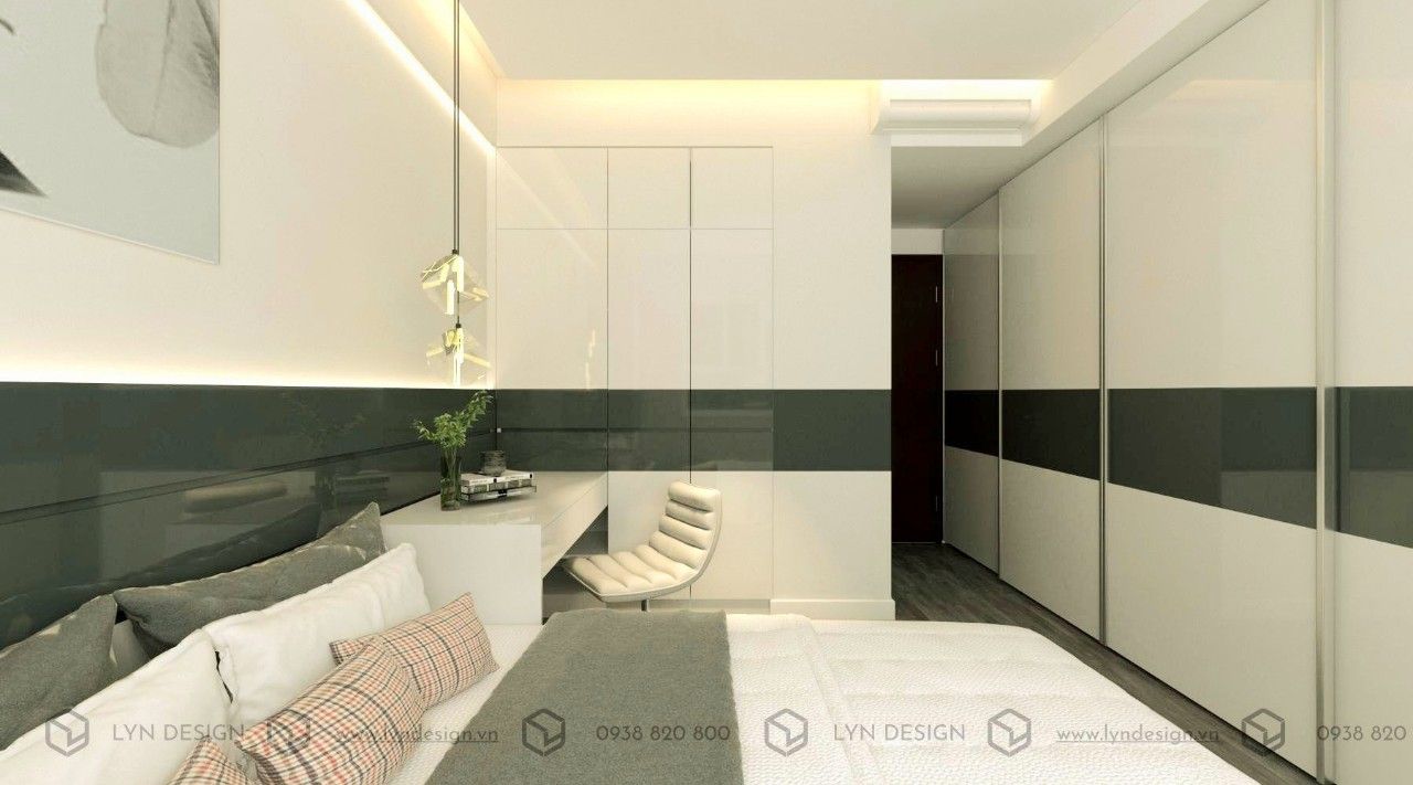 Không gian phòng ngủ master được thiết kế với vách đầu giường có màu trùng tông với màu tủ tạo cảm giác liền khối cho căn phòng là một điểm nhấn ấn tượng biến không gian này trở nên rộng rãi đến bất ngờ.