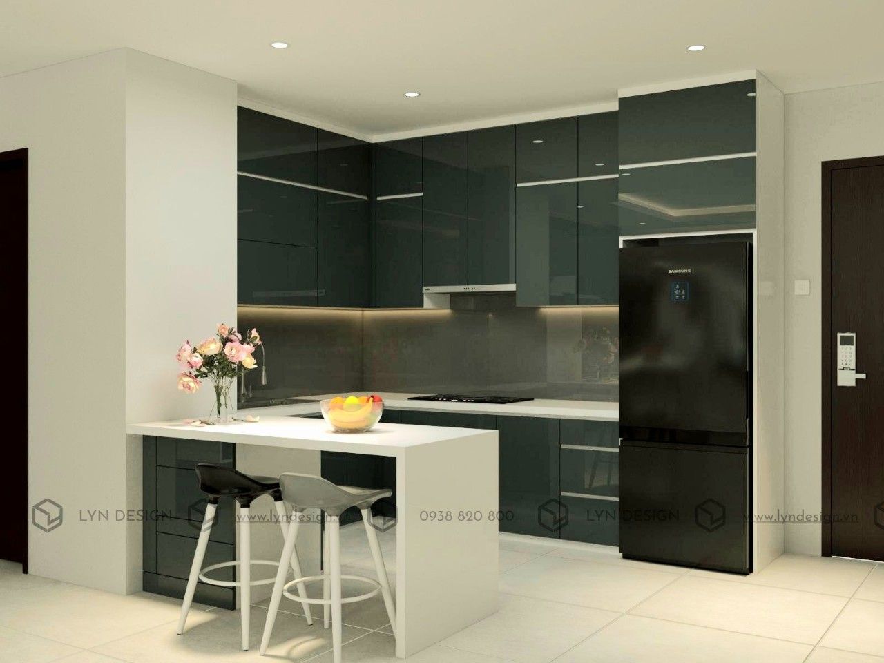 Thiết kế phòng bếp sang trọng với tông màu trắng - xám điểm nhấn cho căn bếp là mặt kính vàng nổi bật trẻ trung, năng động.Hệ tủ bếp đảo được kết hợp với mặt bàn ăn để tiết kiệm diện tích và tăng không gian sinh hoạt được ốp đá trắng sứ cao cấp.