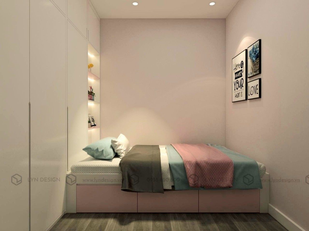 Phòng khá nhỏ với những thiết kế giúp tận dụng tối đa diện tích. Tủ quần áo, kệ sách sát tường, giường được thiết kế với các ngăn tủ có thể để vật dụng vào giúp căn phòng gọn gàng và thoải mái.
